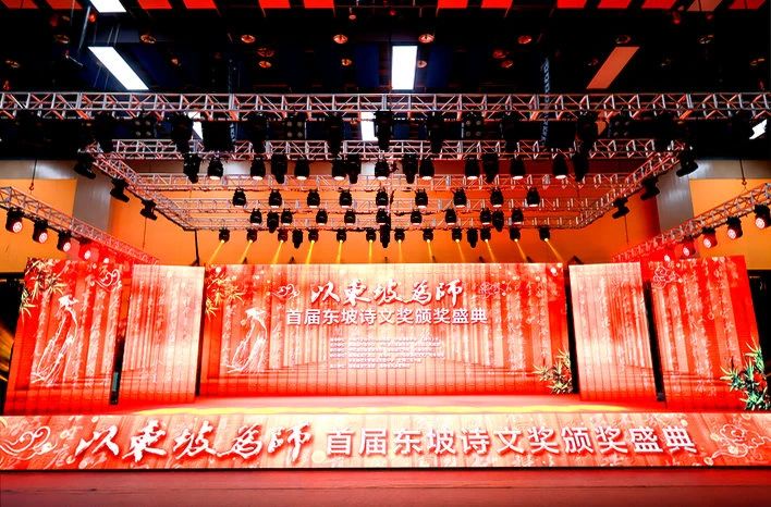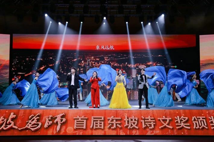 “明月几时有,把酒问青天”。随着情景歌舞《明月几时有》欢快深情的音乐,颁奖盛典拉开帷幕。由苏东坡先生的诗词创意而成的音乐、歌舞贯穿晚会的各个篇章。在一曲曲流传千古的华彩诗句中,首届东坡诗文奖颁奖的各个环节逐一展开。获得首届东坡诗文奖新锐作家奖的五位作家熊焱、榆木、王选、刘星元、朝颜,获得实力作家奖的四位作家孔见、胡竹峰、朱涛、古马分别登台领奖。