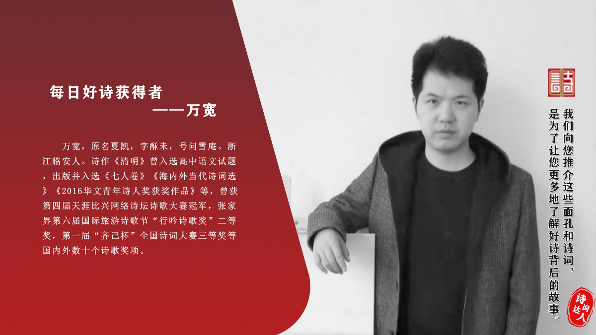 万宽 原名夏凯,字酥未,号问雪庵。浙江临安人。诗作《清明》曾入选高中语文试题,出版并入选《七人卷》《海内外当代诗词选》《2016华文青年诗人奖获奖作品》等,曾获第四届天涯比兴网络诗坛诗歌大赛冠军,张家界第六届国际旅游诗歌节“行吟诗歌奖”二等奖,第一届“齐己杯”全国诗词大赛三等奖等国内外数十个诗歌奖项。