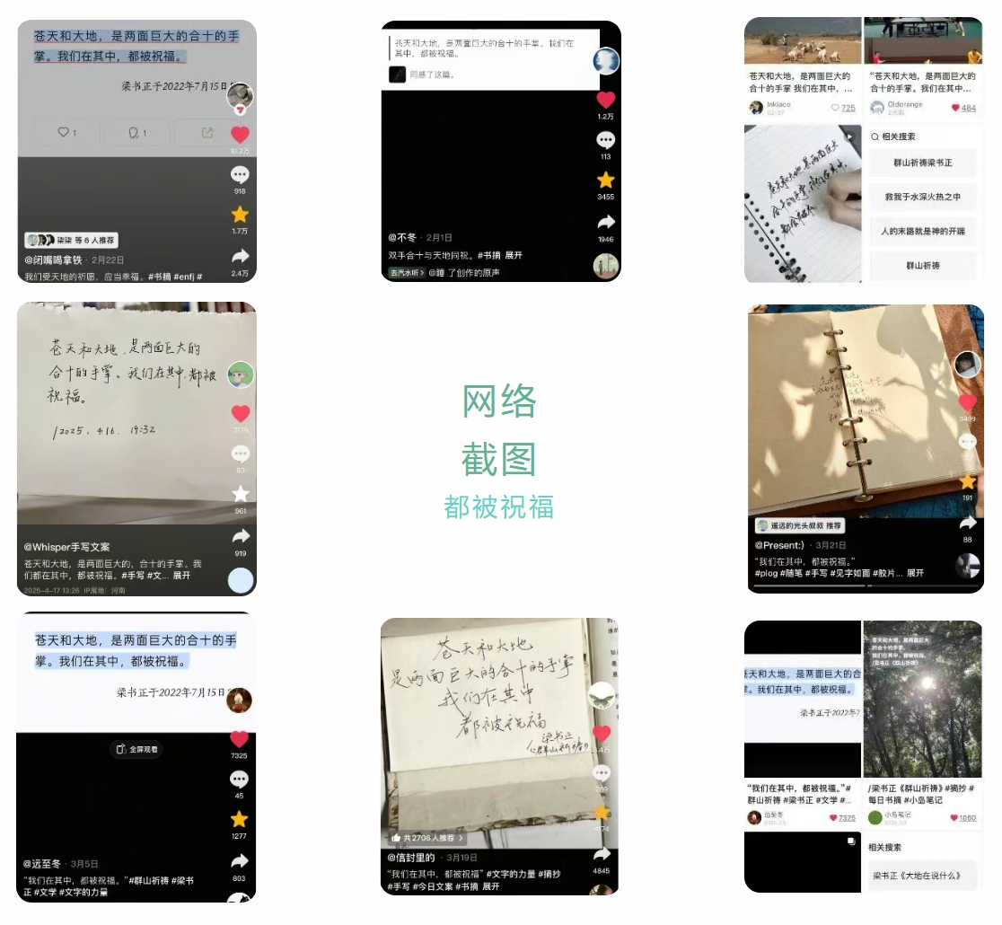 3月初,一句深邃的书摘在抖音平台悄然流行,迅速引发了网友们的热议。这句文字蕴含着神性与慈悲,已引发了100000+万次点赞,恰如其分地诠释了诗歌的力量。有网友感叹道:“伟大的句子”,它以简洁而不失深度的方式,直击人心。这句话出自梁书正的诗集《群山祈祷》中的后记《大地在说什么》。目前,这句文摘依然在不断地发表和发酵,在抖音、小红书、快手、微博等网络媒体上出现了多个几万+的点赞,其他上千的流量更是数不胜数,几乎平均每几分钟就有一条这个文摘的作品发表出来。