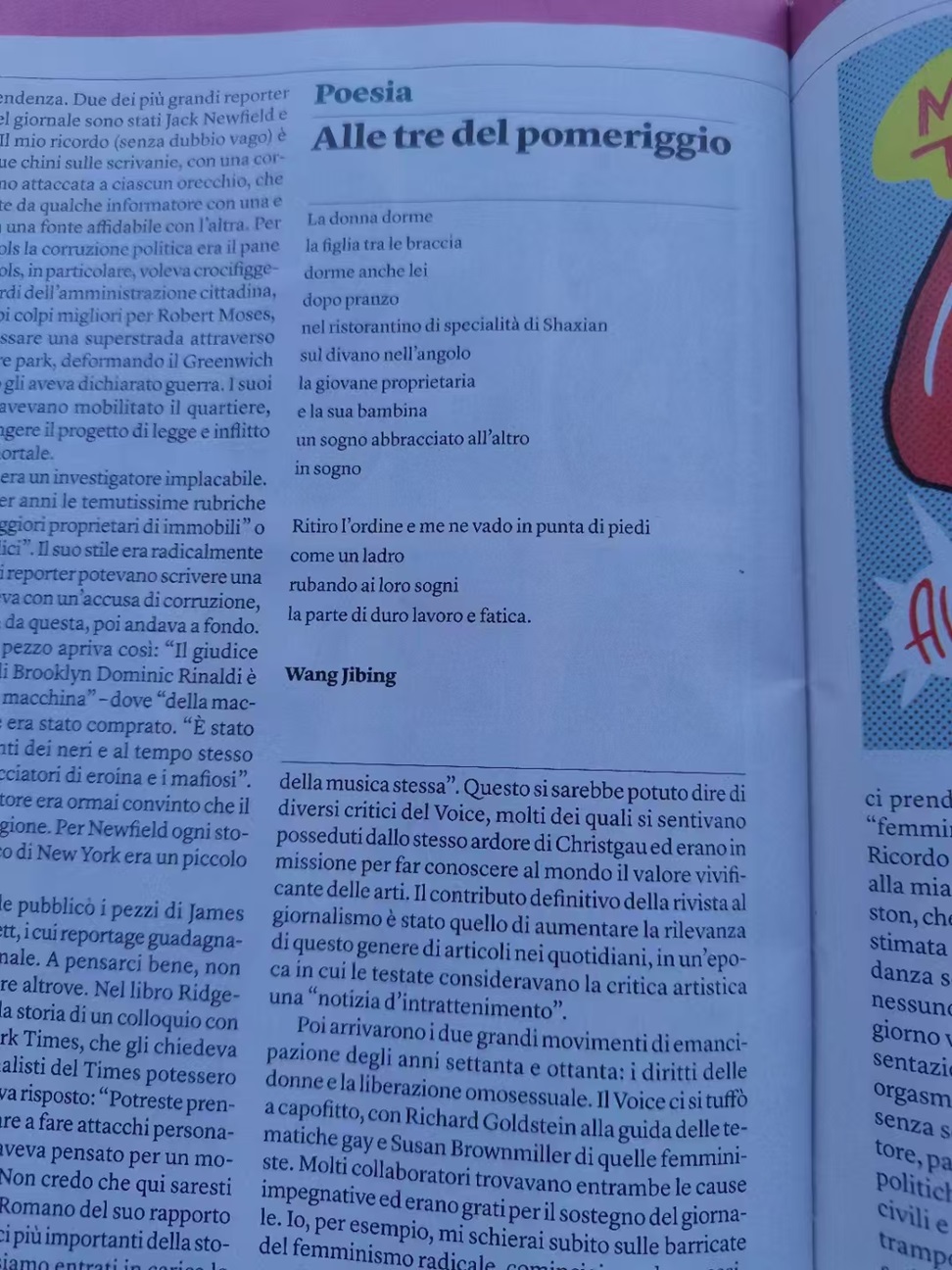 王计兵诗歌《下午三点》刊登在意大利杂志《Internazionale》上