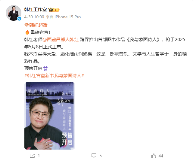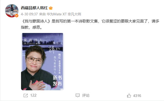 4月30日,韩红在个人社交账号上宣布了自己的第一本诗歌散文集即将面世的消息。