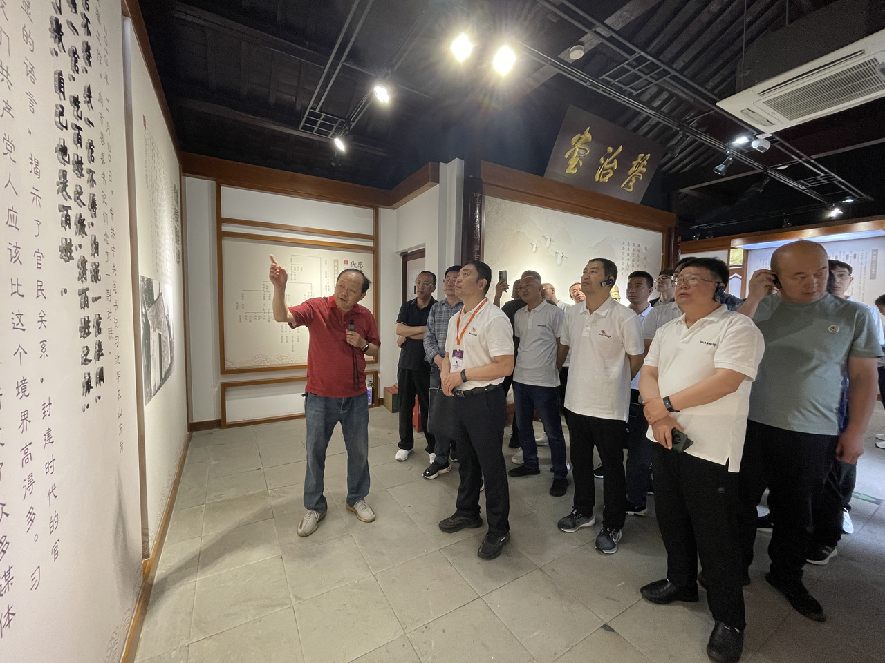 俞华良(左一)为参观者宣讲本土名人文化。