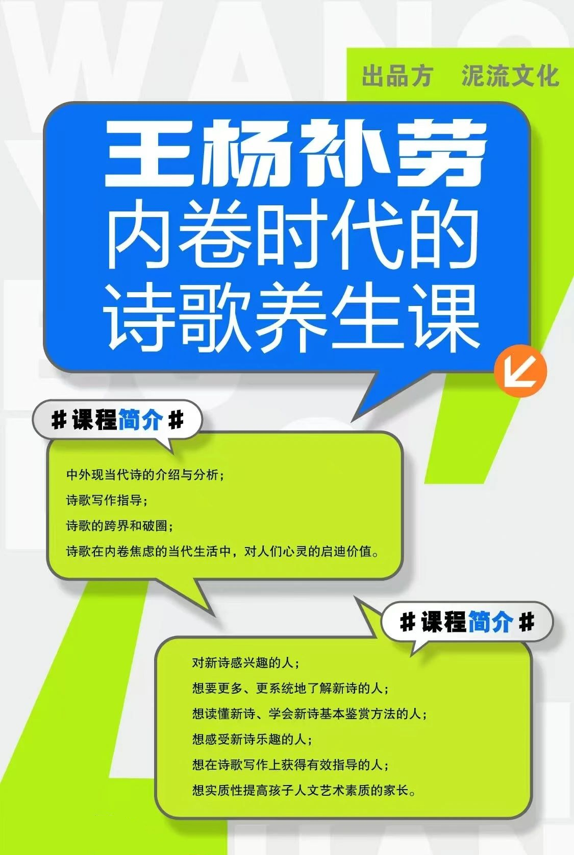 据悉,今年6月下旬,诗人王彻之和杨碧薇将共同开设系列诗歌网课《“王杨补劳”:内卷时代的诗歌养生课》。王彻之常年求学于英美,杨碧薇深耕新诗创作与研究现场,二人在当代诗坛均有独树一帜的诗歌风格和诗学理念,具备丰富的教学经验与生动幽默的教学风格。此次诗歌课融合了两人的视野、经验与知识谱系,相得益彰,为喜爱诗歌艺术的朋友提供了走近和理解当代诗、提升个人审美趣味、扩展文化视野的绝佳机会。课程适用对象:对新诗感兴趣、想要系统了解新诗的人;想读懂新诗、学会新诗基本鉴赏方法的人;想在新诗中获得乐趣的人;有一定的写作基础,希望在诗歌写作上能获得有效指导的人;想实质性提高孩子人文艺术素质的家长。