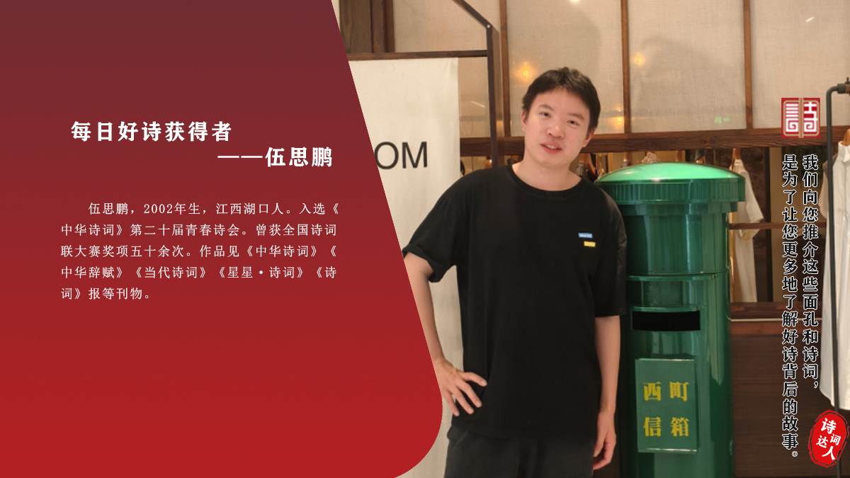 伍思鹏 2002年生,江西湖口人。入选《中华诗词》第二十届青春诗会。曾获全国诗词联大赛奖项五十余次。作品见《中华诗词》《中华辞赋》《当代诗词》《星星·诗词》《诗词》报等刊物。