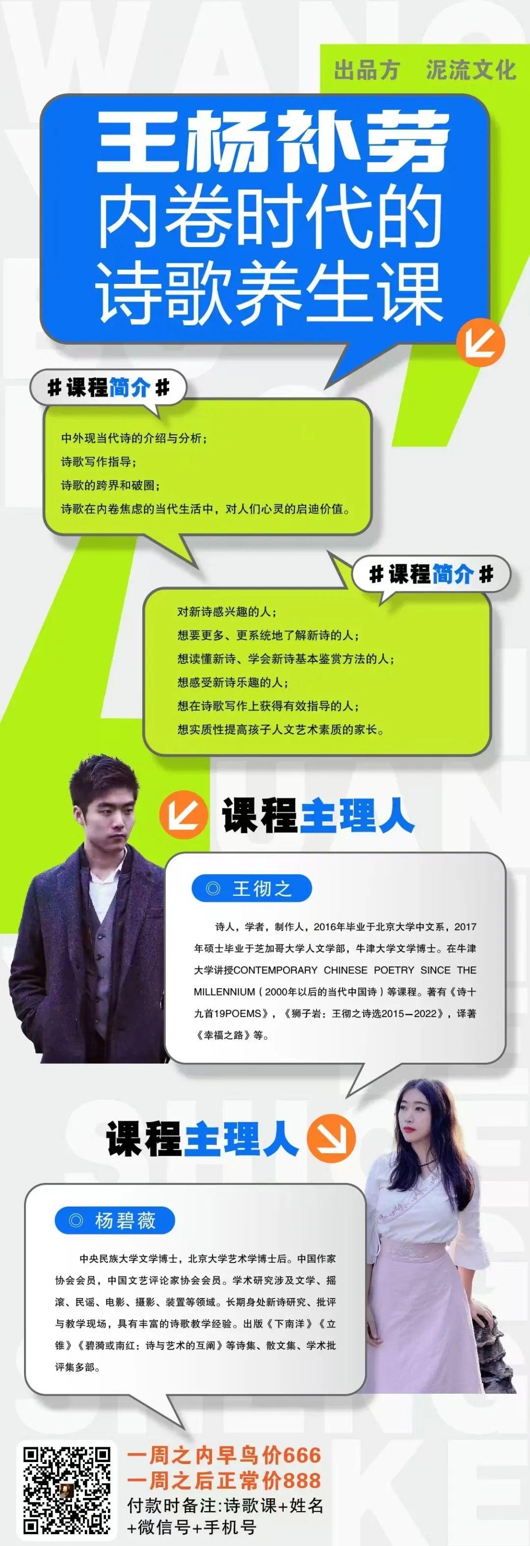 本次线上诗歌课由青年诗人杨碧薇和王彻之共同开设,泥流文化出品。王彻之和杨碧薇是当代中国青年诗人中的代表人物,在近年不断取得创作实绩,斩获各种奖项,深受业内外读者的认可。王彻之常年求学于英美,杨碧薇常年深耕新诗创作与研究现场,二人在当代诗坛均有独树一帜的诗歌风格和诗学理念,具备丰富的教学经验,和生动幽默的教学风格。此次诗歌课融合了两人的视野、经验、和知识谱系,相得益彰,为喜爱诗歌艺术的朋友们提供了不能错过的,走近和理解当代诗、提升个人审美趣味、扩展文化视野的绝佳机会。本次课程即日起启动宣传,名额有限,先到先得,22日前报名者可免费参与线下活动,并有机会获赠作者亲签精美图书好礼。