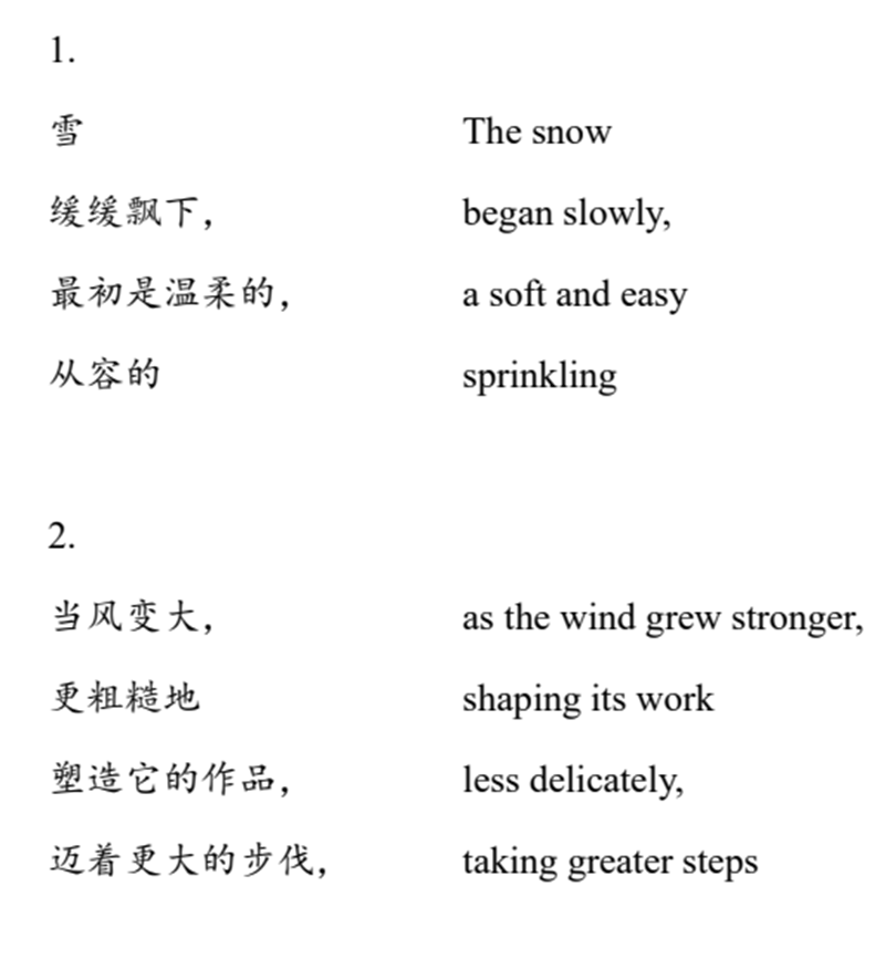 在第一则语料中,诗行短,全是单音节或双音节词,音感流畅,工整清晰,犹如下小雪时婉约宁静的氛围。每行都有半元音s开头的词汇,构成具有节奏感的全韵头韵,像是平稳无风时的落雪,落下的瞬间雪花间距大致恒定。第一行snow的ow与第二行slowly的ow声音重复,slowly的ly与第三行easy的sy押全韵,此二者又与最后一行sprinkling的ling形成半韵,相似又有细微区别的尾韵像是飘落一程的雪,在重力和空气阻力的作用下,不同质量的雪花最终会形成不同的加速度,已经不像初落瞬间那样齐整。