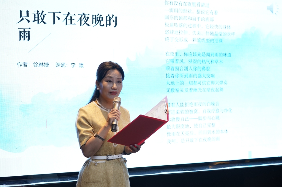 随后,首届雨悦诗会“雨诗朗诵会”开始,朗诵艺术家闻罡、金山、李媛、李昱、杨春水、陆琳琳、计纯等朗诵了20位到场诗人关于“雨”的原创诗歌,诗人们及围观群众纷纷称赞,朗诵会选题很好,既贴合雨悦山房的雨意,又突出了主题诗歌的独特性,一个朗诵会专门朗诵“雨”诗,在全国是第一次。