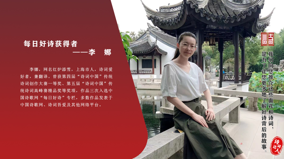 李娜 网名红炉添雪,上海市人,常年客居异地,诗词爱好者。曾获第四届“诗词中国”传统诗词创作大赛一等奖、润物堂“润物真茶杯”第八届诗文赛优秀奖等,作品散见于中国诗歌网、《诗刊》《诗词报》《长青诗刊》及各诗词公众号。