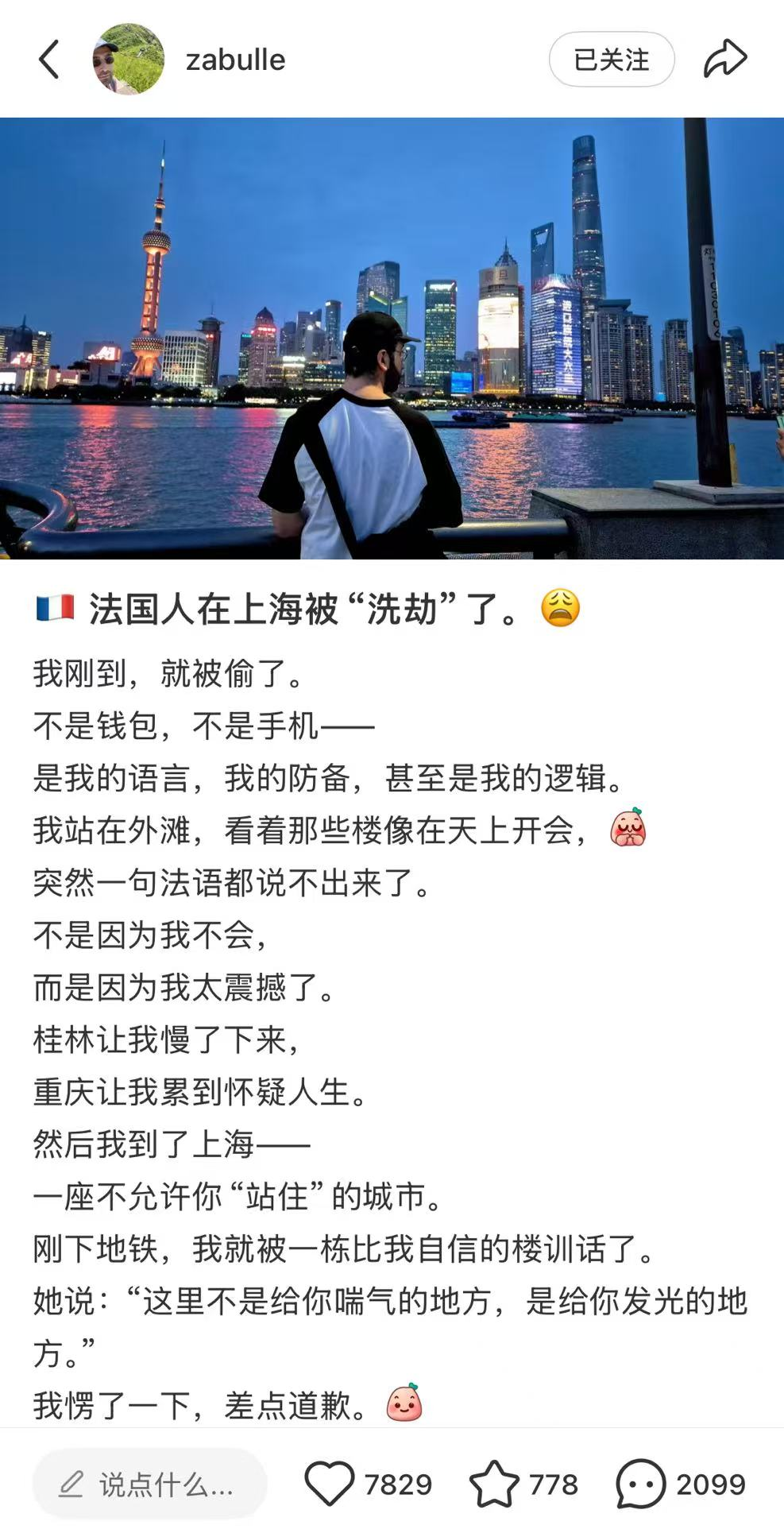 初到上海,Zabulle便写道:“我刚到,就被偷了。/不是钱包,不是手机——/是我的语言,我的防备,甚至是我的逻辑。/我站在外滩,看着那些楼像在天上开会,/突然一句法语都说不出来了。/不是因为我不会,/而是因为我太震撼了。/桂林让我慢了下来,/重庆让我累到怀疑人生。/然后我到了上海——/一座不允许你‘站住’的城市。/刚下地铁,我就被一栋比我自信的楼训话了。/她说:‘这里不是给你喘气的地方,是让你发光的地方。’”