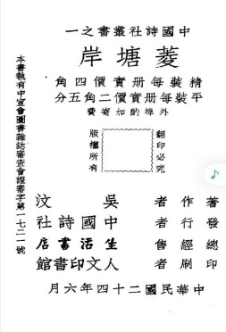 1932年冬季,吴汶转至复旦大学新闻系就读,1935年春季毕业。同年,上海生活书店正式出版他的白话诗集《菱塘岸》,收录了1933至1935年间创作的27首诗,由时任复旦大学新闻系主任谢六逸教授撰写序言。吴汶在诗集后的“写诗小记”中写道,《菱塘岸》中收录的作品被谢六逸先生誉为“象征派的新感觉主义”诗歌,原本数量是现在的五六倍,因为风格多样,大多未被收录,呐喊式的诗则收录于《喷冒集》,反映社会现实的诗则归入《急流渡》。他还提到之前曾编过一本白话诗集《自画像》,从200多首习作中精选了40首,分为“呓语”“自画像”“新绿”“白马秋声”四部分,创作在上虞白马湖春晖中学时期(1928)、上海复旦附中时期(1929)、复旦大学中文系(1930-1932)时期,由复旦大学中文系赵景深教授作序。由此可见,吴汶对自己诗歌的要求极高,不满意的作品宁愿不出版或不发表。虽然《自画像》《喷冒集》《急流渡》大多已散佚,但《菱塘岸》和《吴汶古诗词集1928-1980》(1992)及一些家人保存的诗稿得以流传。诗作《自画像》曾于1936年在上海《文学大众》“九·一八”五周年纪念特刊上发表: