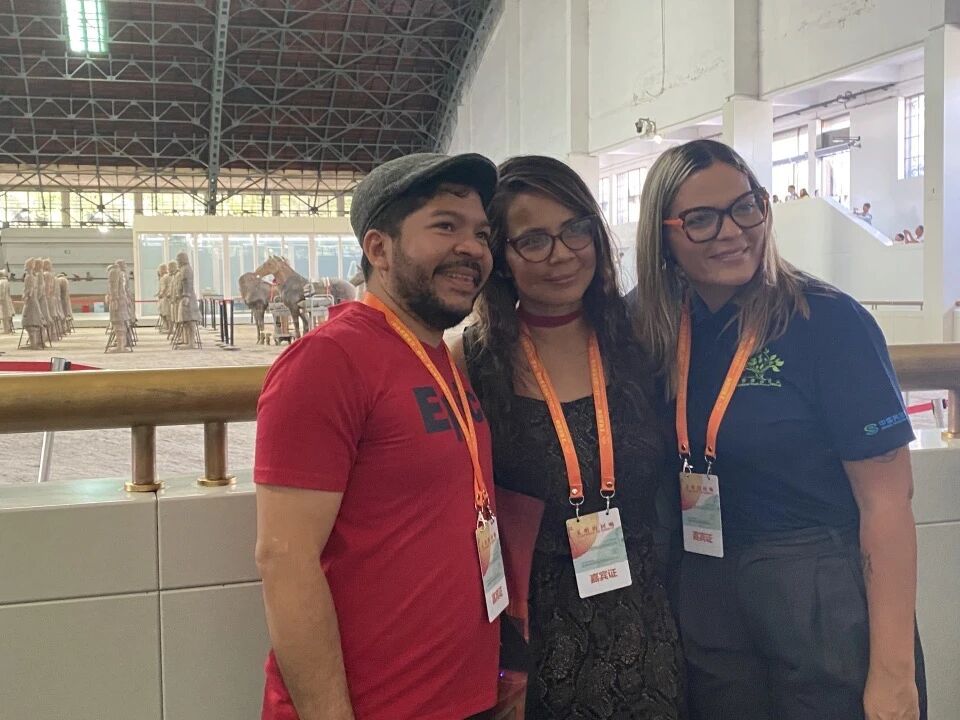 巴拿马诗人哈维尔·阿尔瓦拉多(左)、哥伦比亚诗人法迪尔·德尔加多(中)、委内瑞拉诗人因迪拉·卡尔皮奥·奥利沃在秦始皇帝陵博物院合影。