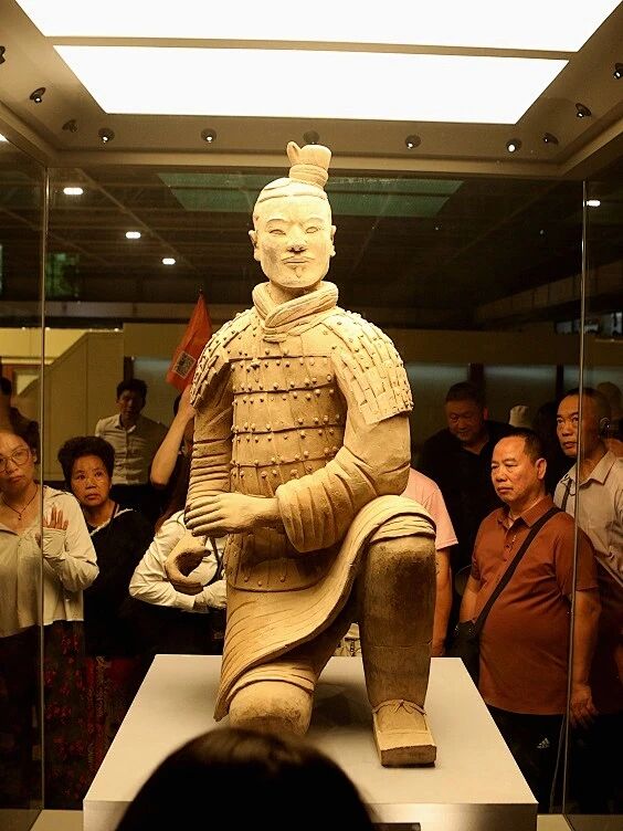 秦兵马俑二号坑的一尊玻璃柜里,安放着一座被工作人员亲切地称为“幸运星”的跪射俑,它身着战甲,左腿曲蹲,右膝着地,双手置于身体右侧作握弓弩待发状,是目前唯一一座出土时完好无损的陶俑,也成为秦始皇帝陵博物院的镇馆之宝。诗人们认真听讲解员介绍跪射俑精细的塑造和生动的神态,仔细观察陶俑身上铠甲的纹路和发髻、履底的刻画。阿德里安·门迭塔·莫克特苏马在找好角度拍下其完整样貌后说道:“兵马俑的庄严令人动容。这里的每尊陶俑都有独特的鼻梁曲线、迥异的面部形态以及个性化的手势。这些手势就像诗歌,不断传递着完整的情感。”