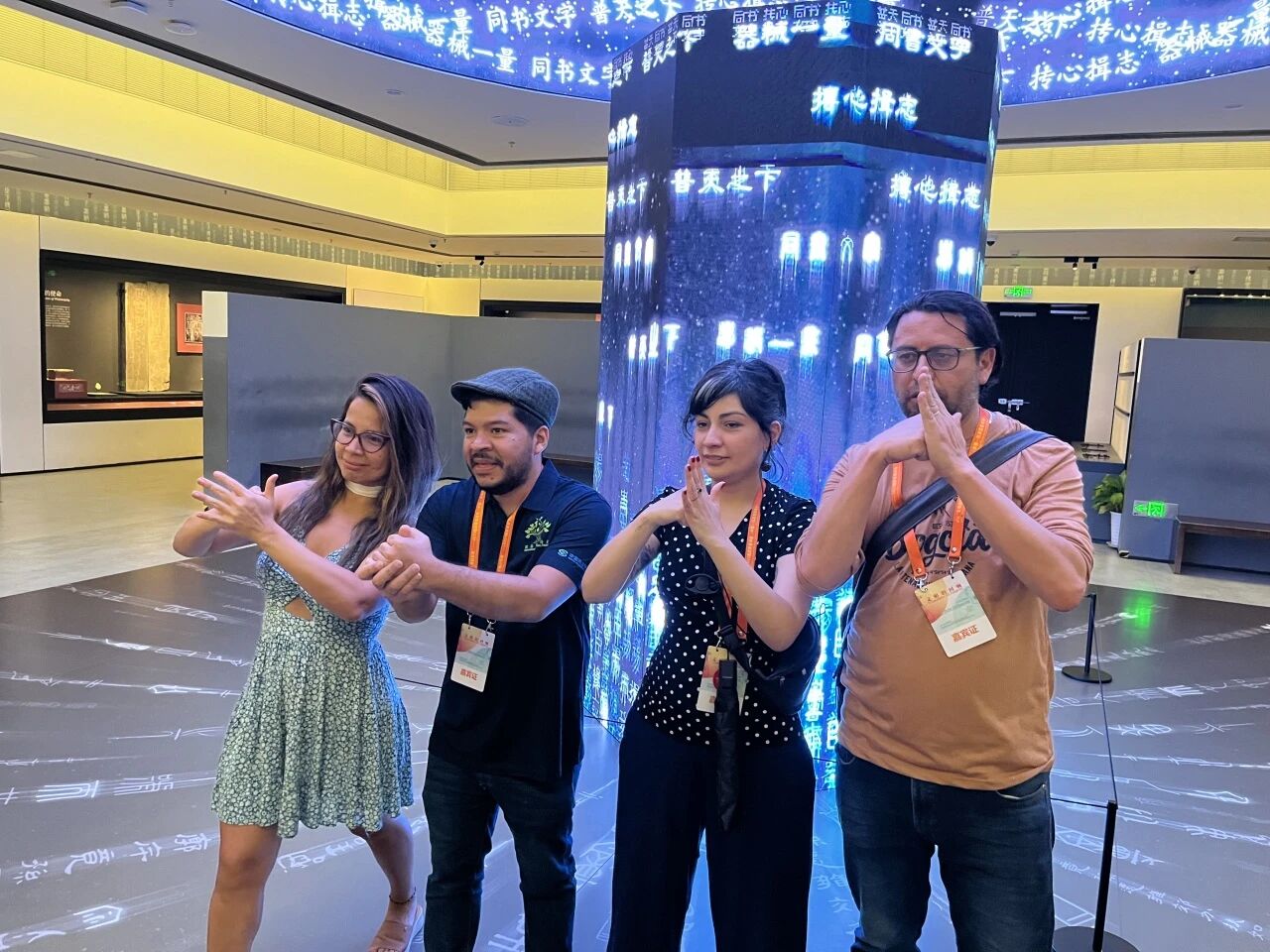 拉美诗人们在博物馆互动装置前行拱手礼并喊“你好大秦”