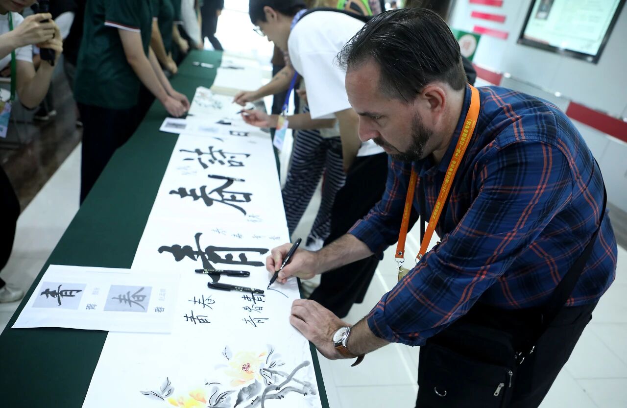 “这个字是‘青’,是一种颜色;这个字是‘春’,意思是春天。这两个字合起来组成一个美丽的词——‘青春’。”中国的青年诗人站在巴拿马诗人哈维尔·阿尔瓦拉多的身旁,向他介绍他刚在宣纸上描摹下的这两个字的含义。宣纸铺展于案上,墨迹未干的“青春”二字仍泛着光泽。哈维尔·阿尔瓦拉多注视着自己刚写下的这两个字,眼中满是惊喜。