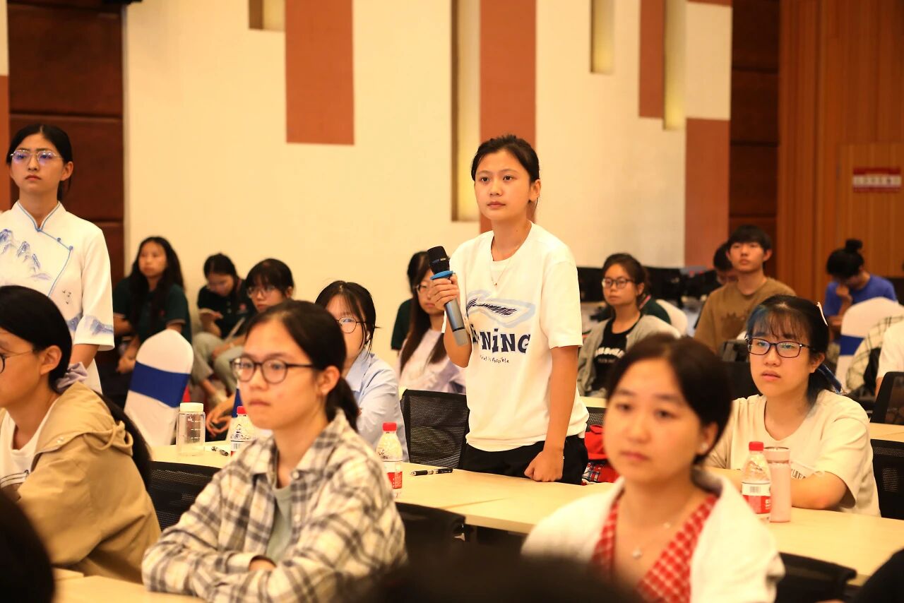 在进入会场前,诗人们被邀请在迎宾台留下墨迹,他们手握毛笔,一笔一画地将“青春诗会”四个字临摹在纸上,并在赠送的白纸扇面上写下“平安”“开心”“祝福”等有着美好寓意的词。在志愿者的帮助下,诗人们在水桶中滴上了几种自己喜欢的颜料,绯红、明黄、浅蓝等颜色在水面缓缓晕开,逐渐交融。白纸扇面缓缓放入水中,色彩附着其上,一把独一无二的美丽漆扇就制作而成了。这动人的创作过程,恰是诗会最生动的象征:文学的交流,从来不是孤立存在的色块,正如水面上交融的色彩,在思想的碰撞与情感的共鸣中,交织成一幅鲜活灵动、耀眼夺目的文明图谱,让诗意在交融中愈发绵长有情。