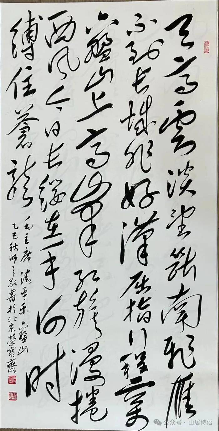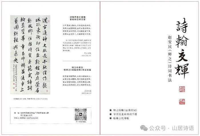 “诗翰交辉——赵安民(师之)诗词书法展”,于2025年9月26日在北京琉璃厂文化街两个场地同步开展,主场地是琉璃厂东街15号北京嘉福印信博物馆,另一场地在他的工作室——松雪草堂。这次展览系统呈现师之在诗词与书法领域的多年探索成果,反映“师之诗翰”传承学习、交相辉映之大概情况,包括三大板块:师之诗翰(自书诗词),学习毛主席诗词手迹,临摹古帖。东街主场地展出作品40多幅,内容是他自己的诗词30多首,及毛主席诗词7首;还展出他临王羲之《兰亭序》帖与临赵孟頫《王羲之逸事》帖两幅手卷作品。