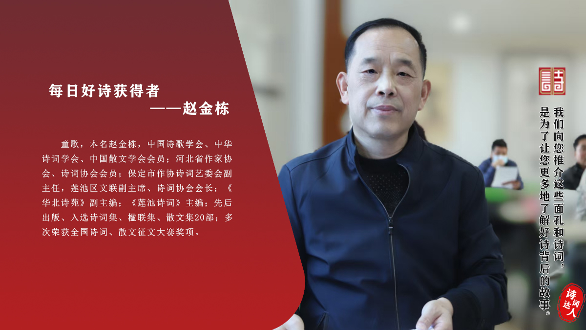 童歌,本名赵金栋,中国诗歌学会、中华诗词学会、中国散文学会会员;河北省作家协会、诗词协会会员;保定市作协诗词艺委会副主任,莲池区文联副主席、诗词协会会长;《华北诗苑》副主编;《莲池诗词》主编;先后出版、入选诗词集、楹联集、散文集20部;多次荣获全国诗词、散文征文大赛奖项。
