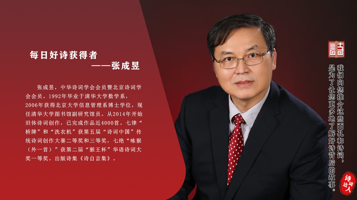 张成昱,中华诗词学会会员暨北京诗词学会会员。1992年毕业于清华大学数学系,2006年获得北京大学信息管理系博士学位,现任清华大学图书馆副研究馆员。从2014年开始旧体诗词创作,已完成作品近4000首。七律“桥牌”和“洗衣机”获第五届“诗词中国”传统诗词创作大赛二等奖和三等奖,七绝“咏猴(外一首)”获第二届“猴王杯”华语诗词大奖一等奖。出版诗集《诗自言集》。
