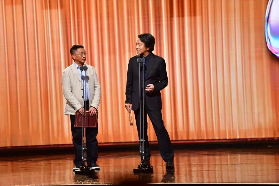 刘慈欣(左)为诗歌奖、科幻文学奖开奖
