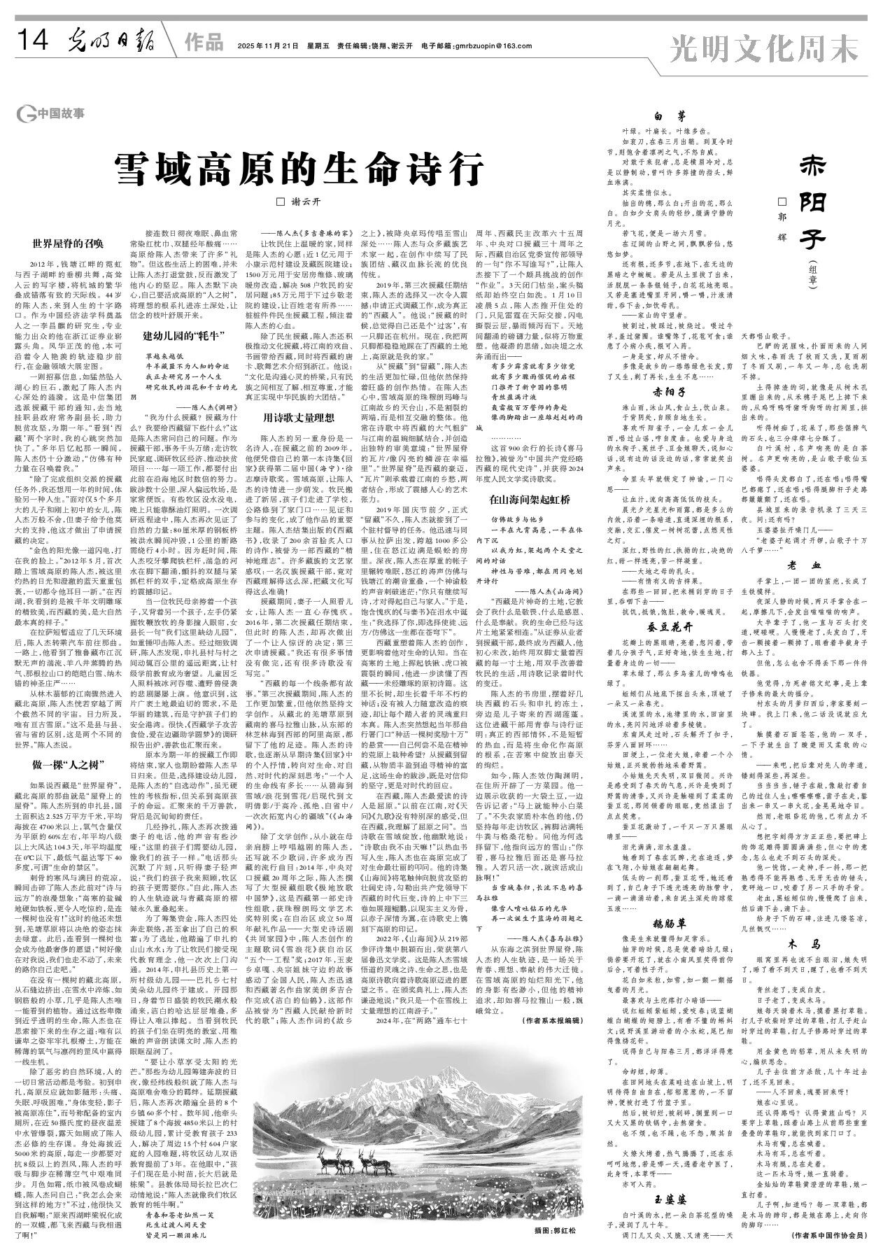 在西藏,陈人杰最爱读的诗人是屈原。“以前在江南,对《天问》《九歌》没有特别深的感受,但在西藏,我理解了屈原之问”。当诗歌在雪域绽放,他幽默地说:“诗歌由我不由天嘛!”以热血书写人生,陈人杰也在高原完成了对生命最壮丽的叩问。他的诗集《山海间》将笔触伸向脱贫攻坚的壮阔史诗,勾勒出共产党领导下西藏的时代巨变,诗的上中下三卷如展翅鲲鹏,以现实主义为骨,以赤子深情为翼,在诗歌史上镌刻下高原的印记。