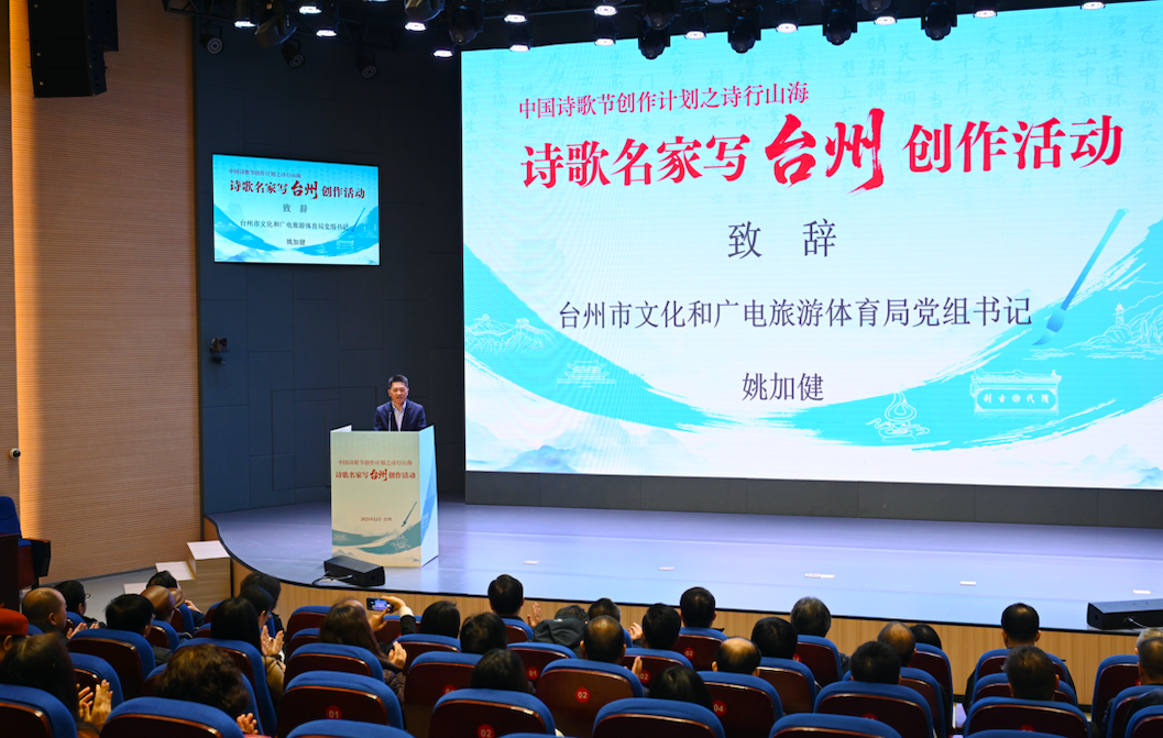 台州市文化和广电旅游体育局党组书记姚加健在致辞中表示,2026年,第八届中国诗歌节将在这片诗意盎然的土地上绽放,这是对台州千年文脉的最好肯定,也是对台州文化建设成果的极大认可。为了迎接2026年的诗歌盛会,台州已开展了一系列卓有成效的预热活动:深挖文化底蕴,让千年诗路“活”起来;推动艺术的跨界融合,让诗歌之美“潮”起来;激发全民的参与热情,让诗歌土壤“厚”起来。诚挚邀请各位诗人朋友,走进台州的灵山秀水,感受这里的山海奇观,体会这里的人文底蕴,用你们生花的妙笔,书写新时代的台州诗篇。相信通过这次创作活动,必将为第八届中国诗歌节积累更多优秀作品,为台州的文化建设注入新的活力。