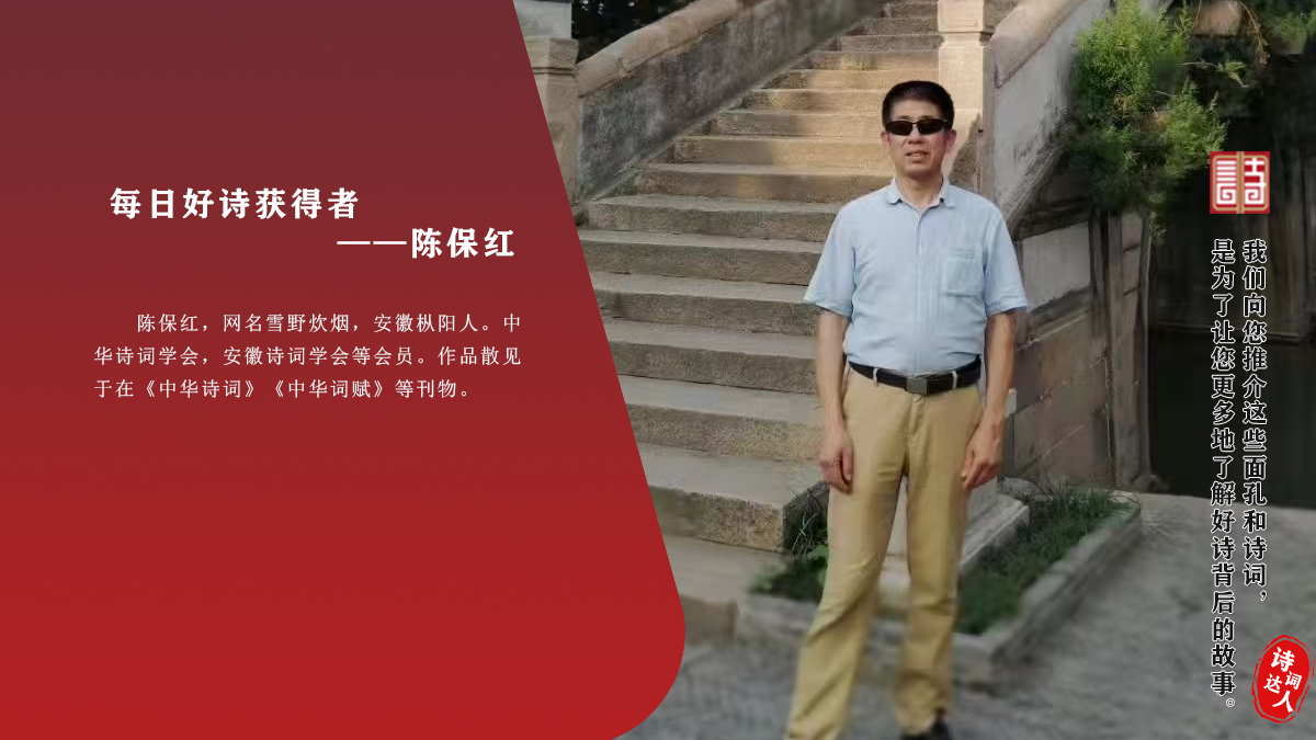 陈保红,网名雪野炊烟,安徽枞阳人。中华诗词学会,安徽诗词学会等会员。作品散见于在《中华诗词》《中华词赋》等刊物。