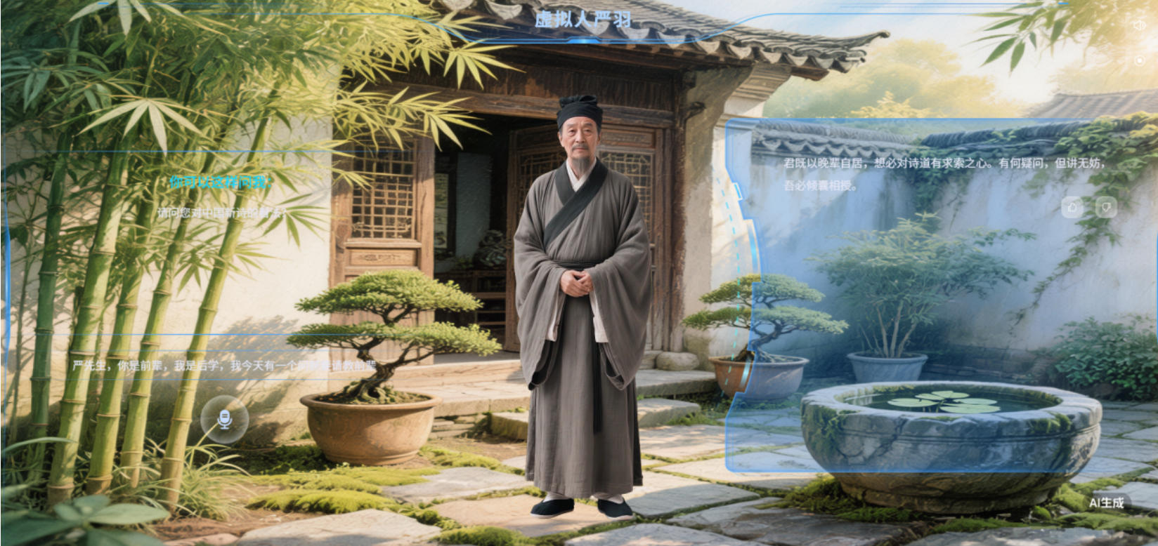 随后,其他嘉宾也加入提问行列,提出了如何评价“江湖派”和朦胧诗,如何看待AI写诗,以及对中华诗词研究院的发展方向有何建议等跨越古今、涉及多个维度的提问,严羽的“回答”始终紧扣其诗学核心,却又与当代语境紧密相连。