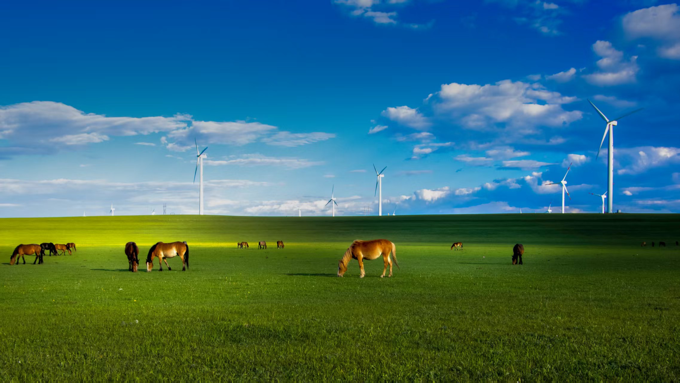 夏日的辉腾锡勒草原,风车巨大的叶片