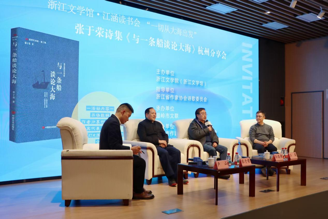 12月21日,“一切从大海出发”张于荣诗集《与一条船谈论大海》分享会在浙江文学馆举行。此活动由浙江文学馆主办,浙江省作家协会诗歌委员会为指导单位,温岭市文联承办。浙江省文联党组成员、书记处书记曹鸿,浙江省作协副主席、鲁迅文学奖获得者沈苇,浙江省文物局副局长夏丹荷,浙江文学馆馆长、浙江文学院院长程士庆,浙江省作协诗歌委员会主任孙昌建 , 温岭市委宣传部副部长、文联主席江君丽,北回归线创始人梁晓明 ,浙江工商大学金收获写作中心执行主任王自亮,《江南诗》编辑部主任江离,以及游离 ,胡理勇,李郁葱,飞廉,王寒,方石英,卢山,卢艳艳,龚艳,崔岩,徐静,张继宝,林应辉,王小川 ,汪传凯,黄祥云,杨哲华,江维中,吴建,李虹,汤琴文,吕为民,梁辉等文艺界和在杭温岭乡贤以及作者张于荣共70多人参加了分享会。