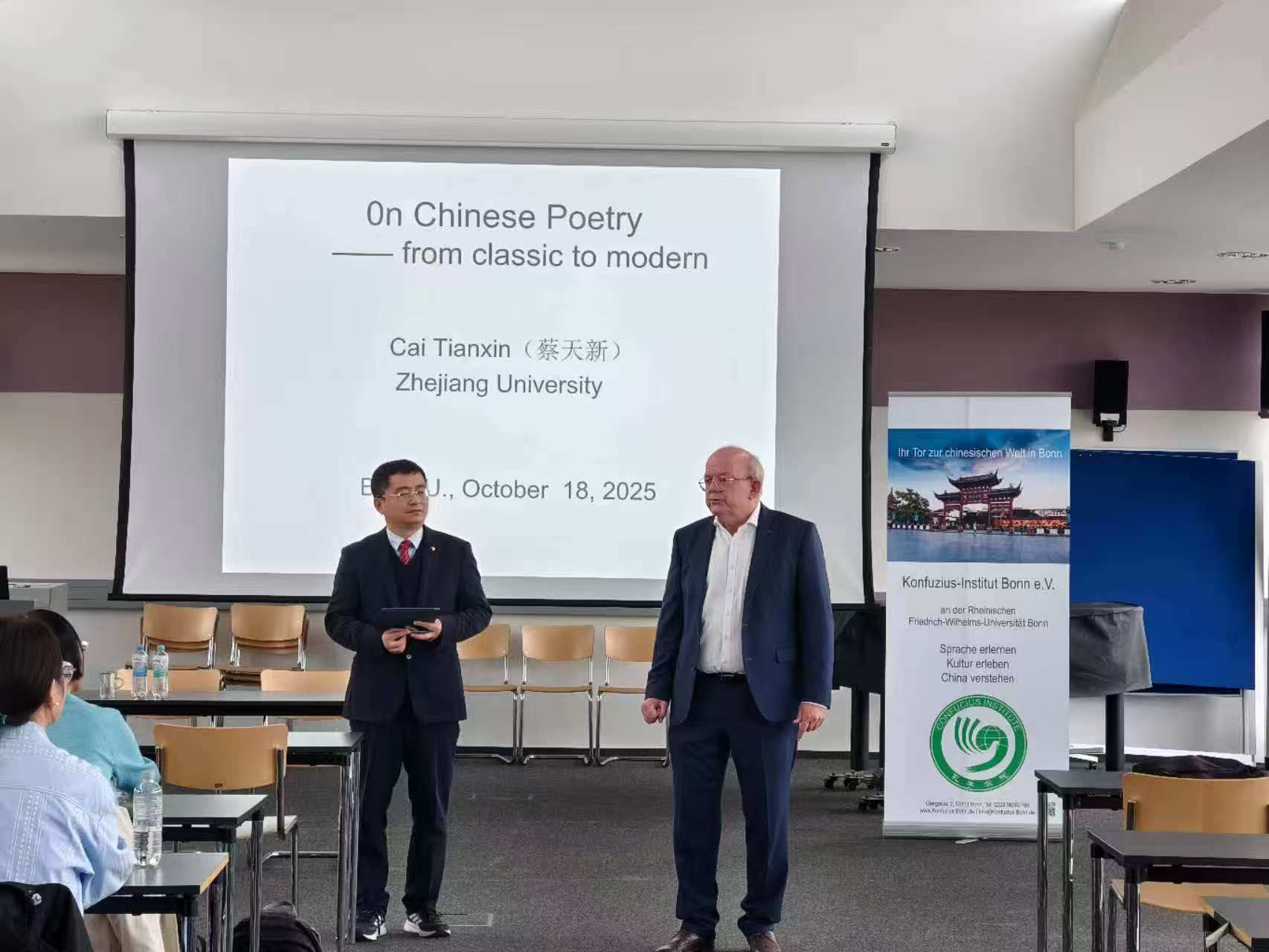 2025年10月18日,应波恩大学汉学系主任廉亚明(Prof. Dr. Ralph Kauz)教授的邀请,正在巴黎索邦大学访学的诗人、浙江大学数学学院教授蔡天新,赴波恩大学做了题为《漫谈中国诗歌——从古典到现代》的讲座。