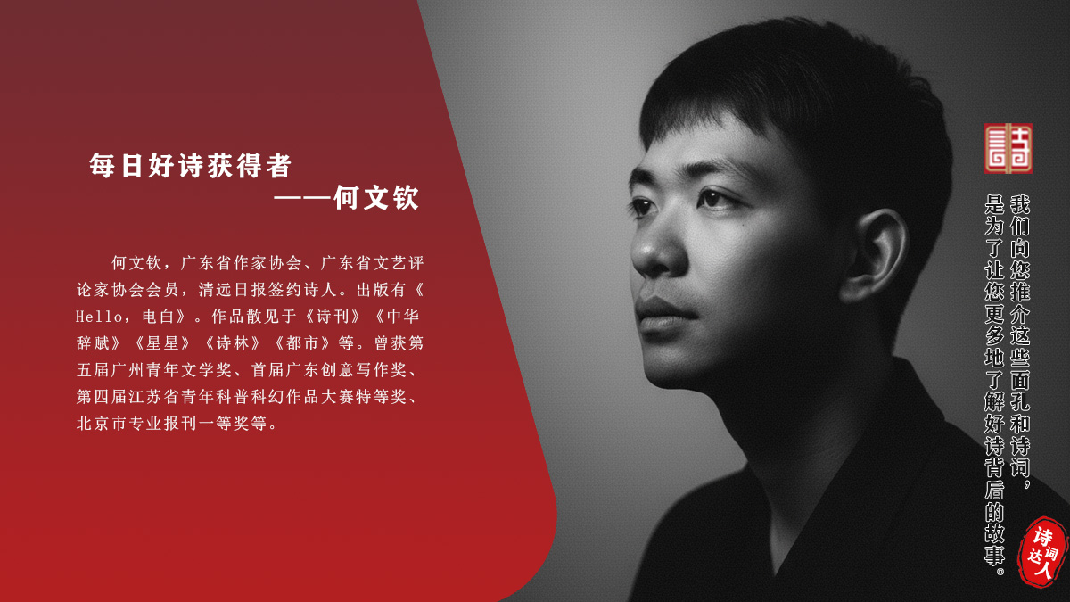 何文钦,广东省作家协会、广东省文艺评论家协会会员,清远日报签约诗人。出版有《Hello,电白》。作品散见于《诗刊》《中华辞赋》《星星》《诗林》《都市》等。曾获第五届广州青年文学奖、首届广东创意写作奖、第四届江苏省青年科普科幻作品大赛特等奖、北京市专业报刊一等奖等。