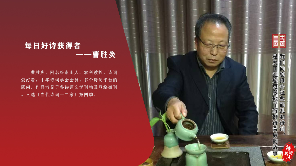 曹胜炎,网名终南山人,农科教授,诗词爱好者。中华诗词学会会员。多个诗词平台的顾问。作品散见于各诗词文学刊物及网络微刊。入选《当代诗词十二家》第四季。