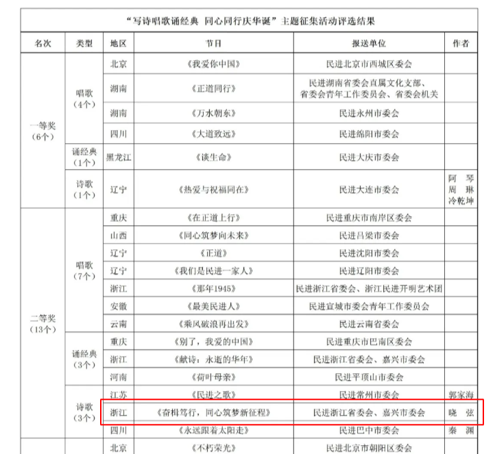 南湖区文坛又添喜讯!近日,在民进中央庆祝成立80周年“写诗唱歌诵经典同心同行庆华诞”主题征集活动中,南湖区新丰镇作家晓弦创作的诗歌《奋楫笃行,同心筑梦新征程》荣获二等奖。