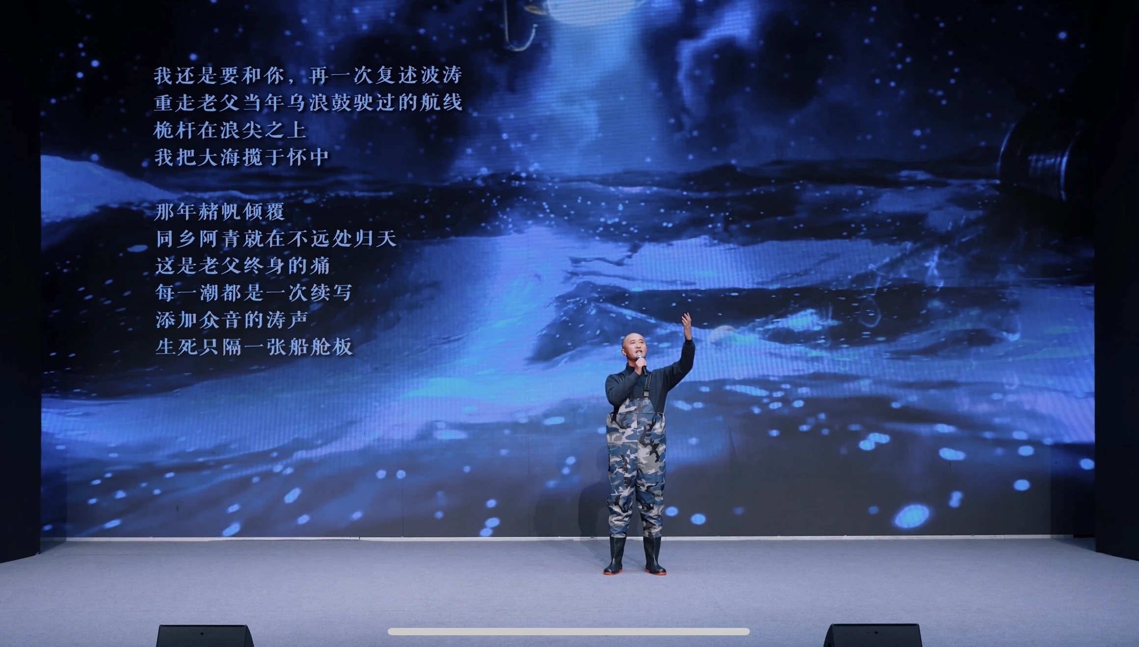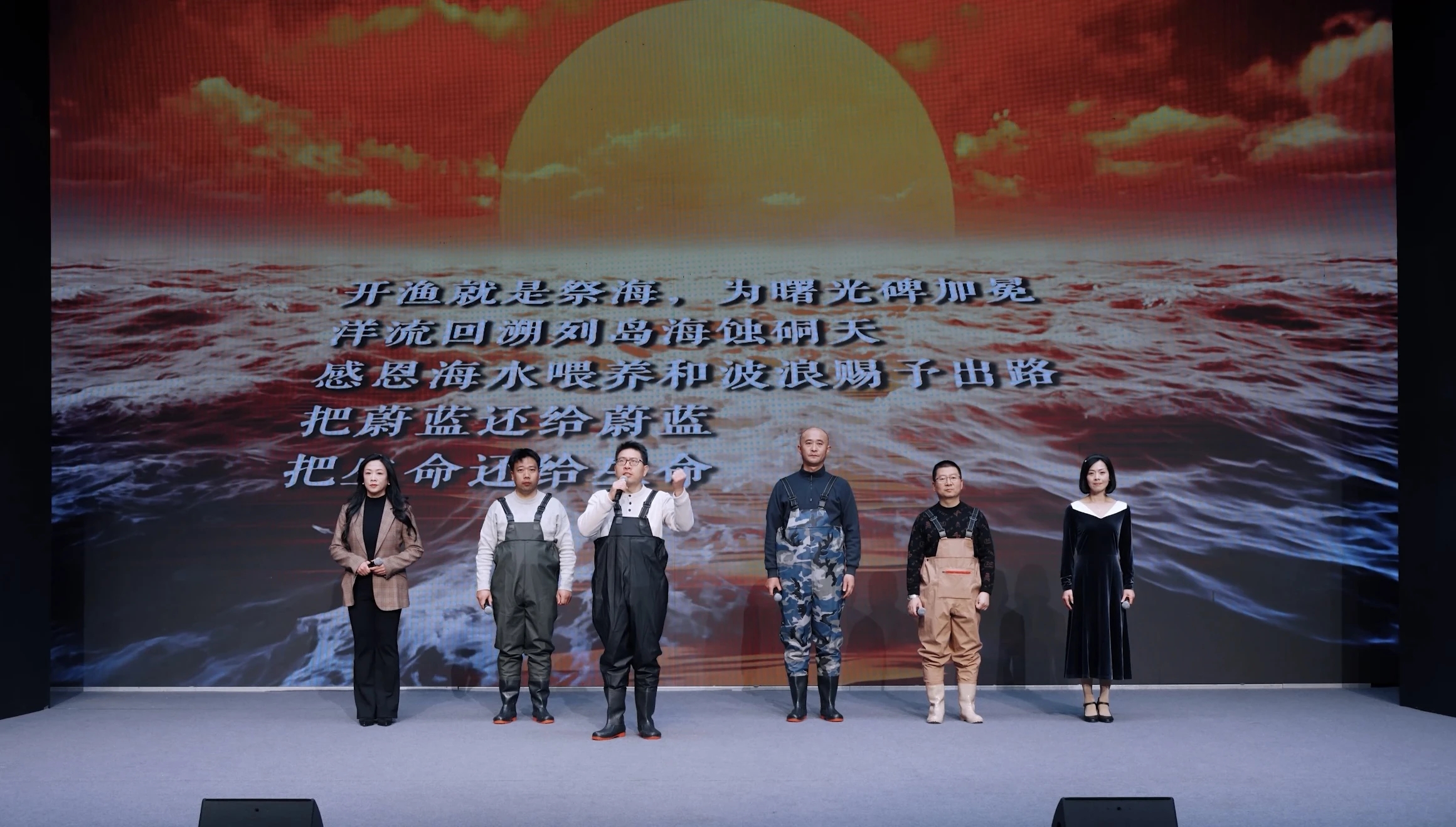 海洋诗剧《灯光围网》由诗人张于荣创作并担任编剧,携手导演汤琴文、音像制作瞿刚冰、演员郭永军等一众艺术家组成主创团队,精心打磨而成。剧中船老大,3位渔民、捕捞专家、诗人等人物共同演绎了东海捕鱼的生动情节,凿开大海蔚蓝的表象,承载并见证着渔民劳作与信仰,阐述了人与海、鱼互为镜像的关系,构建了一个独特的诗性剧情。