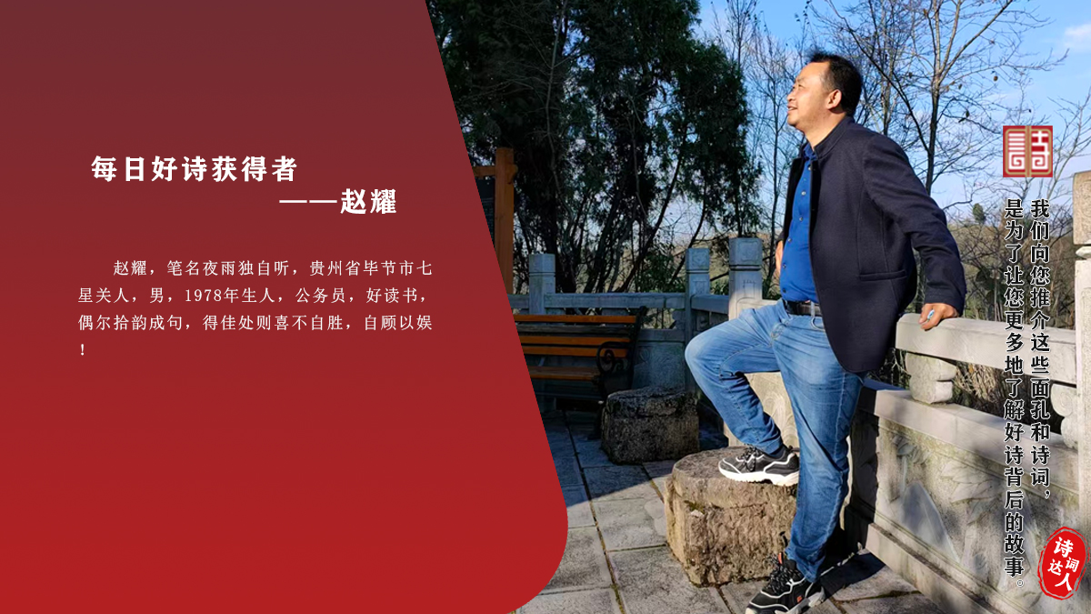 赵耀,笔名夜雨独自听,贵州省毕节市七星关人,男,78年生人,公务员,好读书,偶尔拾韵成句,得佳处则喜不自胜,自顾以娱!