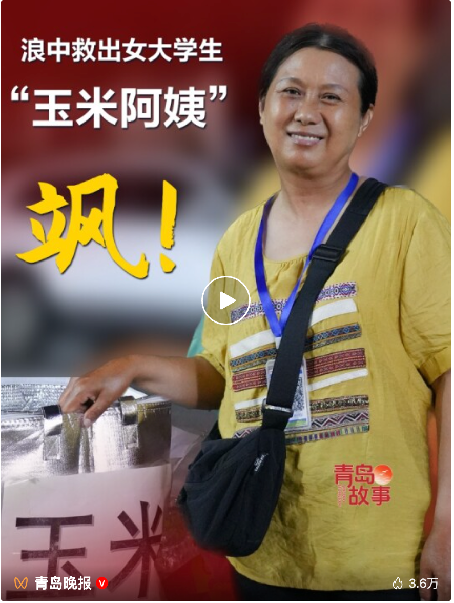7月7日,山东青岛海边,一名21岁女大学生在捡拾落水的手机时,被巨浪卷入海中。危急时刻,附近摆摊卖玉米的58岁阿姨刘玉荣迅速脱掉鞋裤,入水施救。