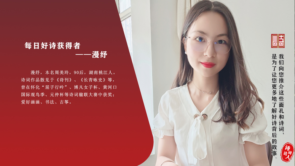 漫纾,本名周美玲,90后,湖南桃江人。诗词作品散见于《诗刊》、《长青咏史》等,曾在怀化“屈子行吟”、博凡女子杯、黄河口国际观鸟季、元仲杯等诗词楹联大赛中获奖;爱好画画、书法、古筝。
