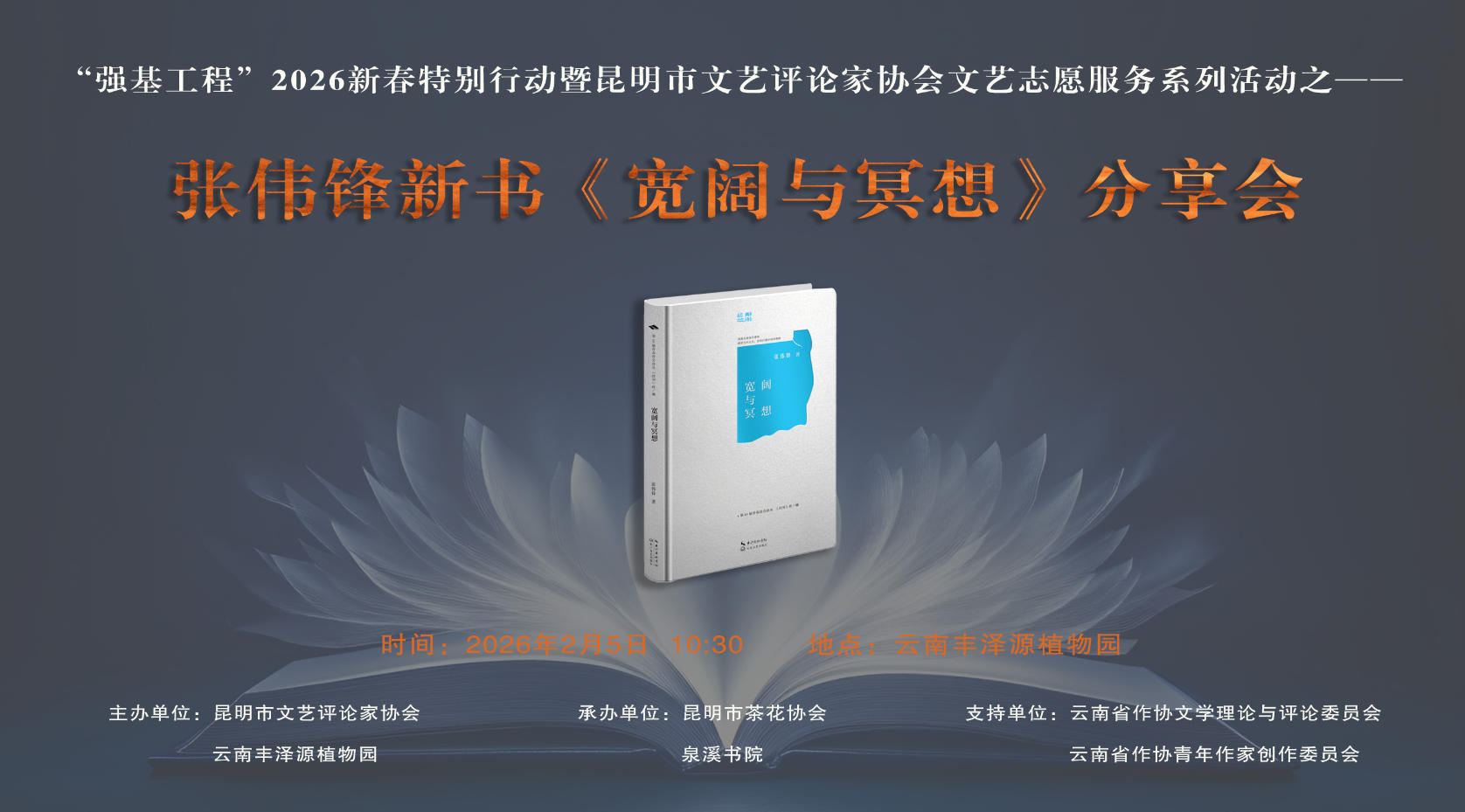 大地回暖万物苏,百花竞放满园春。2月5日,“强基工程”2026新春特别行动暨昆明市文艺评论家协会文艺志愿服务系列活动之张伟锋新书《宽阔与冥想》分享会在云南丰泽源植物园举办。本次活动由昆明市文艺评论家协会、云南丰泽源植物园主办,昆明市茶花协会、泉溪书院承办,云南省作协文学理论与评论委员会、云南省作协青年作家创作委员会支持,旨在让文学艺术贴近实际、贴近生活、贴近群众,生动诠释“有一种叫云南的生活”的文化内涵。