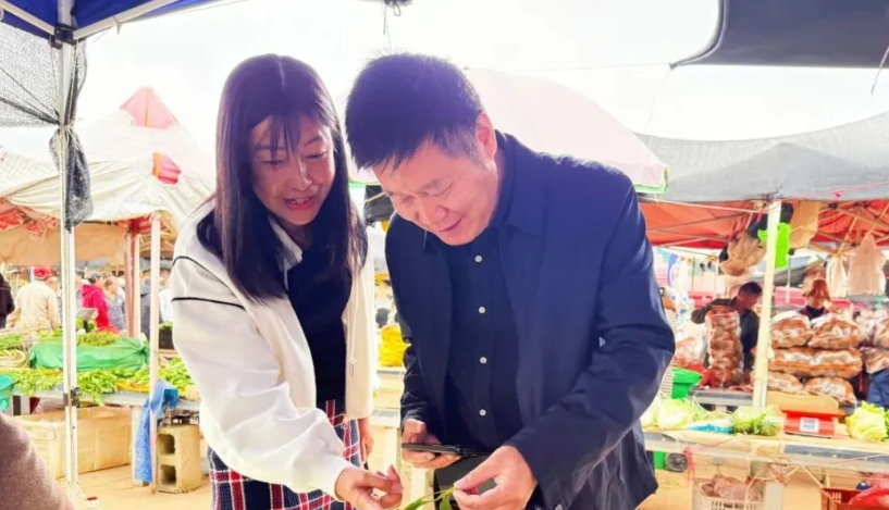 熊育群(右)在柿花园农贸市场调研