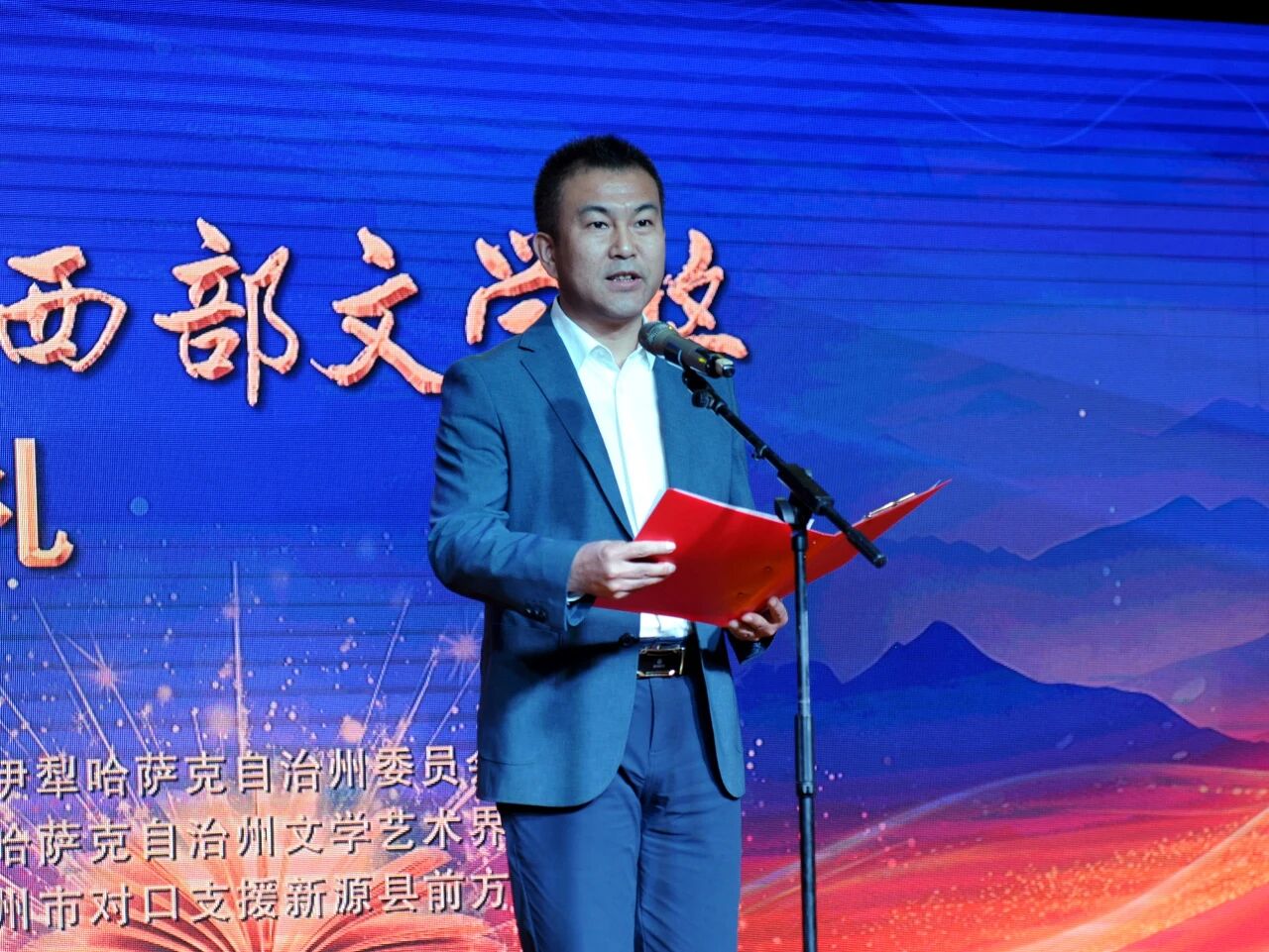 伊犁州党委常委、宣传部部长任建东在致辞中说,文化是民族的精神命脉,文艺是时代的号角。多年来,伊犁州始终坚持以文化人、以文润心,深入推进文化润疆,把铸牢中华民族共同体意识作为文化建设的主线,让各民族优秀文化交相辉映,让家国情怀、民族团结融入文艺创作的方方面面。文学作为文化传承的重要载体,肩负着凝聚人心、汇聚力量、书写时代、讴歌人民的重要使命,而西部文学奖的举办,正是我们以文学为桥,厚植家国情怀、传承丝路文脉、推动文化润疆走深走实的生动实践。愿广大文学工作者坚守初心,扎根人民,以笔传情,以文铸魂,在文化润疆的征程中勇担使命,用心用情讲好伊犁故事、新疆故事、中国故事,让文学之花在天山绽放,让文脉薪火代代相传。
