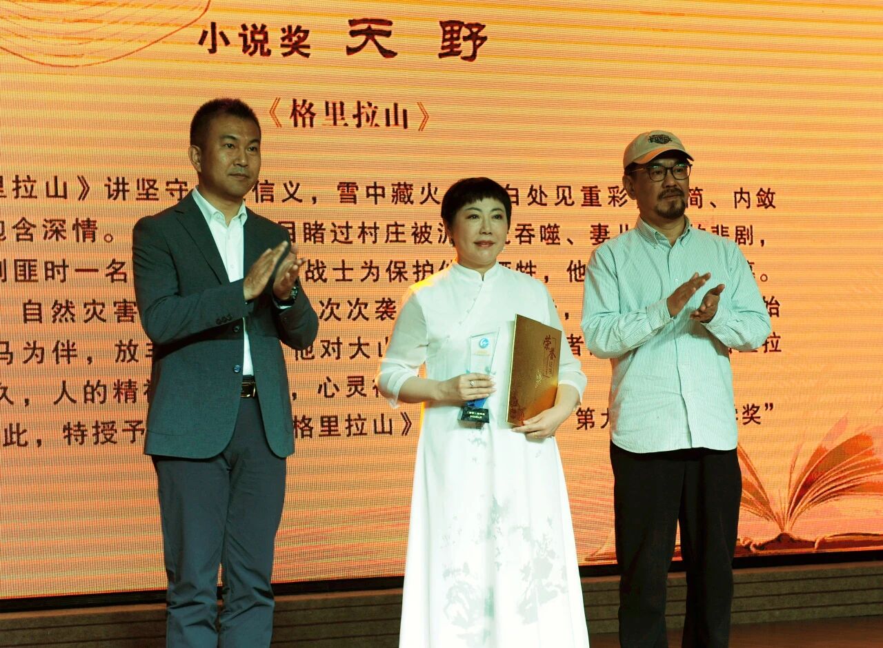 伊犁州党委常委、宣传部部长任建东和浙江作协副主席、浙江传媒学院教授、《西部》原主编沈苇为天野颁奖