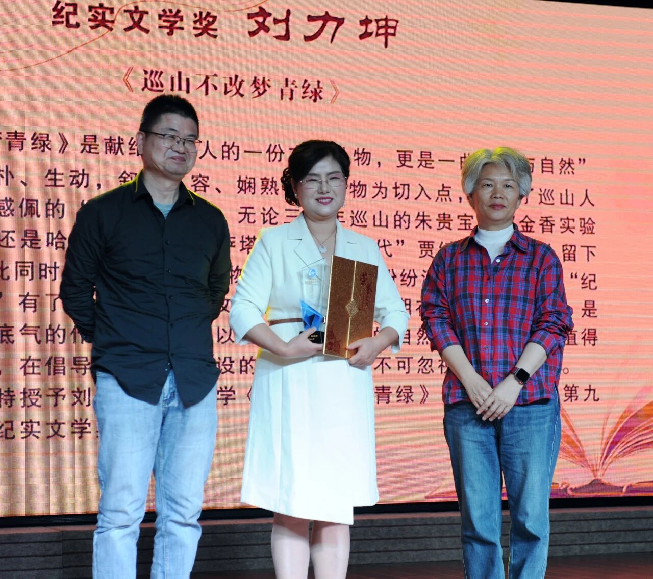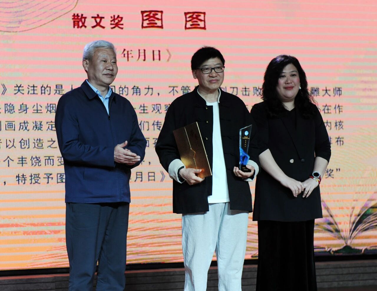 新源县委书记陶春雷和山东省文学期刊社总编辑、《时代文学》主编李婧为图图颁奖
