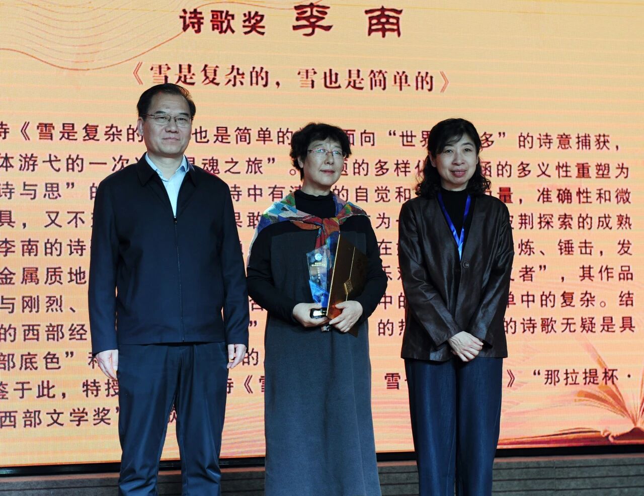 伊犁州文联党组成员、副主席王兴程和北京文学期刊中心副主任、《北京文学》副主编张颐雯为李南颁奖