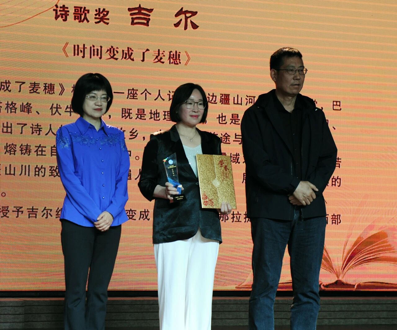 新疆文联第一期刊中心主任、《新疆艺术》主编李丹莉和《十月》副主编谷禾为吉尔颁奖