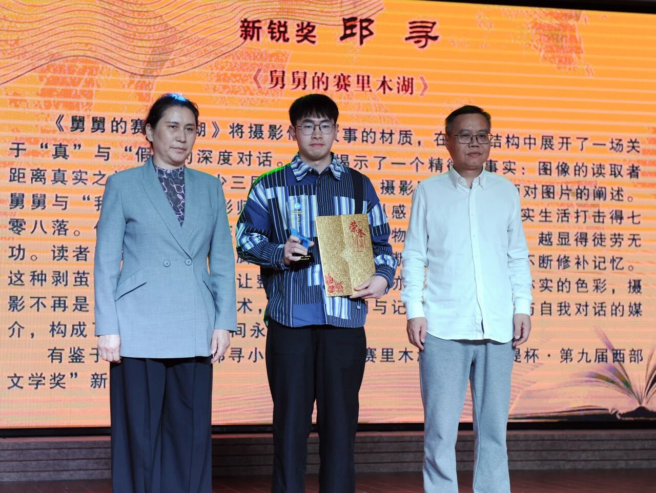 伊犁州文联党组书记、副主席李耕耘和第九届西部文学奖评委、福建师范大学博导、评论家陈培浩为习习颁奖