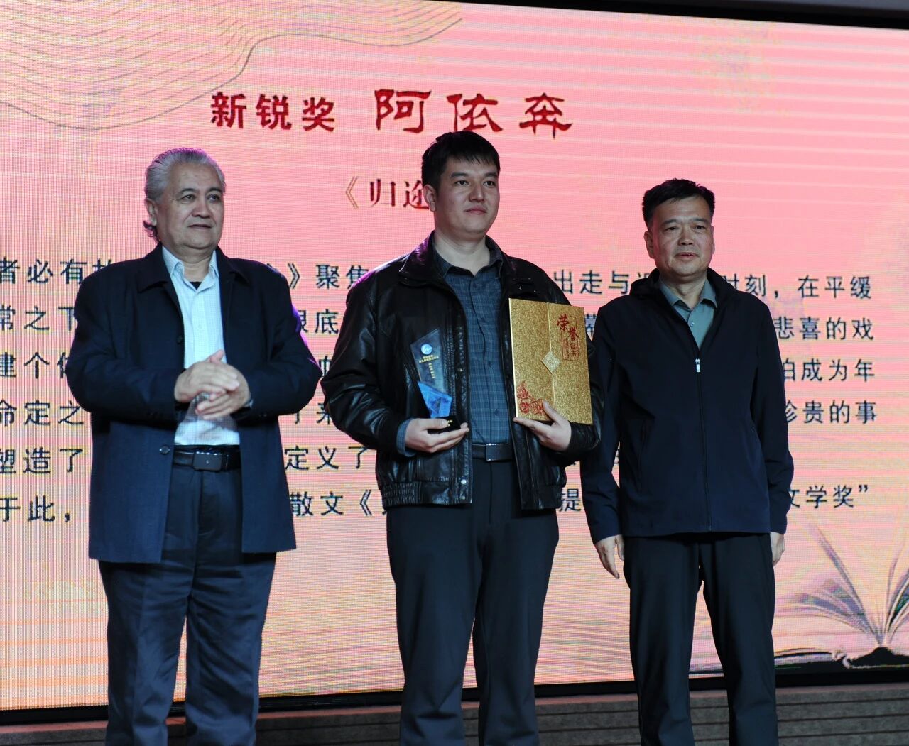 新疆文联原主席、新疆作协名誉主席阿拉提·阿斯木和宁夏文学院副院长、《朔方》副主编杨建虎为阿依奔颁奖