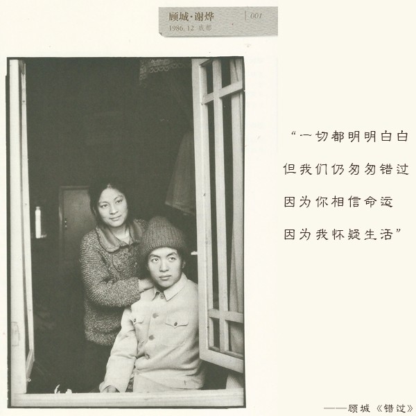 在摄影师肖全的镜头里,那些生于二十世纪五六十年代的当今文艺界精英回到了最初的岁月,一张张面孔记录了那个充盈着激情的理想年代。顾城·谢烨 1986.12《错过》 顾城隔膜的薄冰溶化了, 湖水是那样透彻, 被雪和谜掩埋的生...
