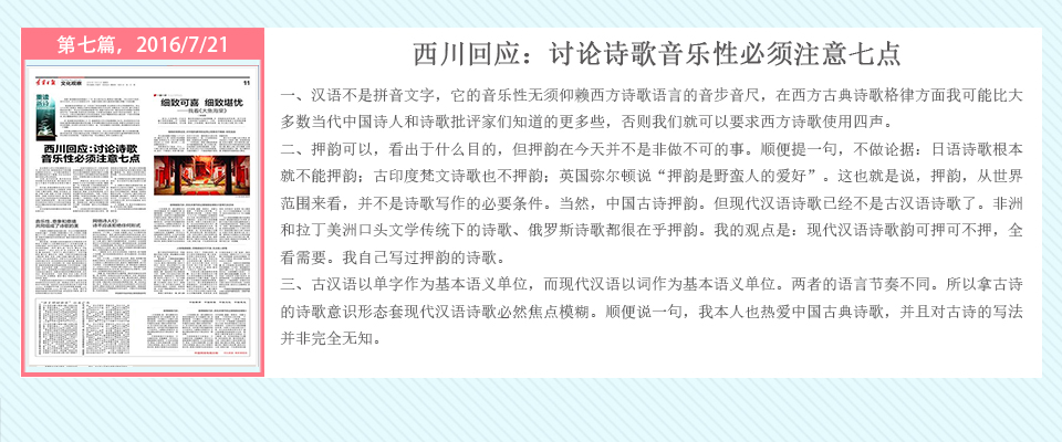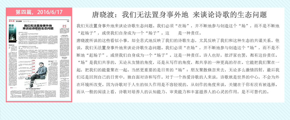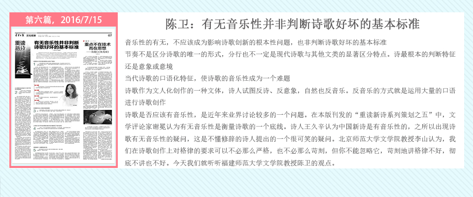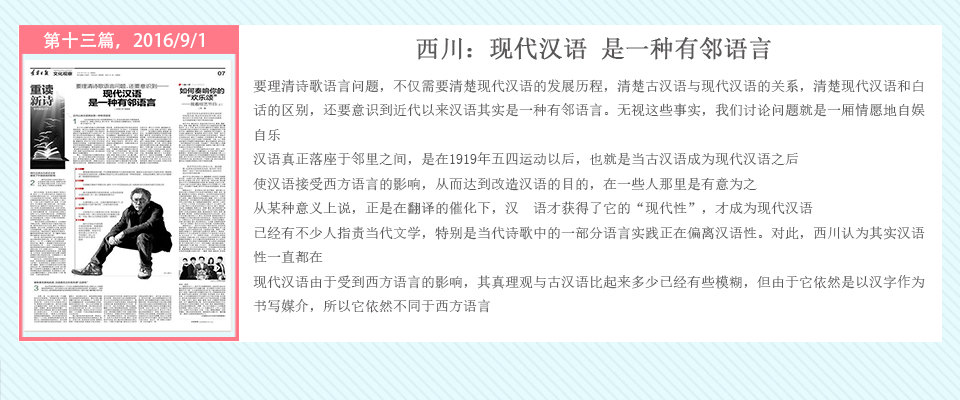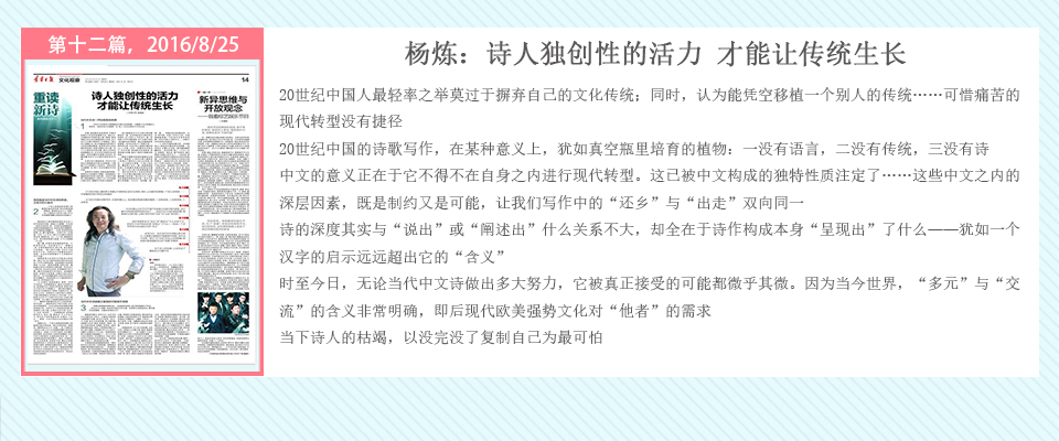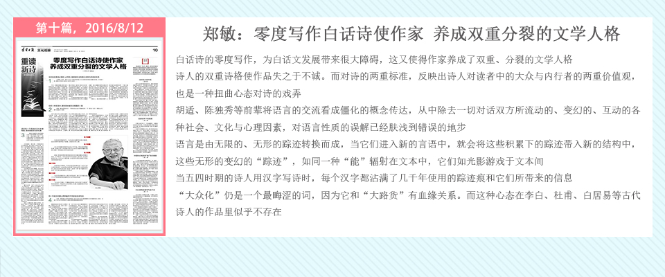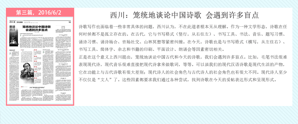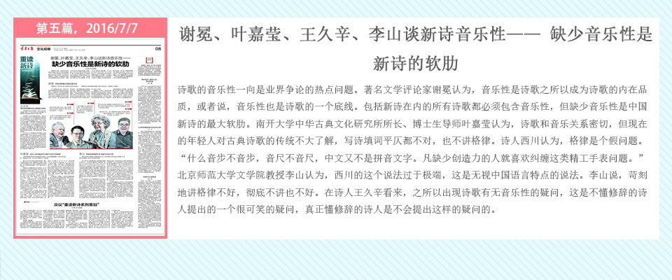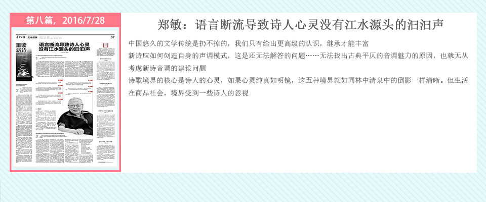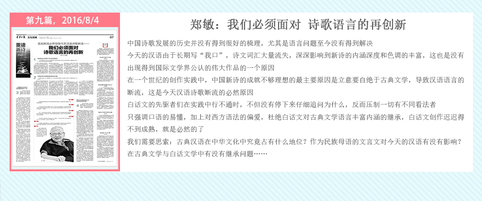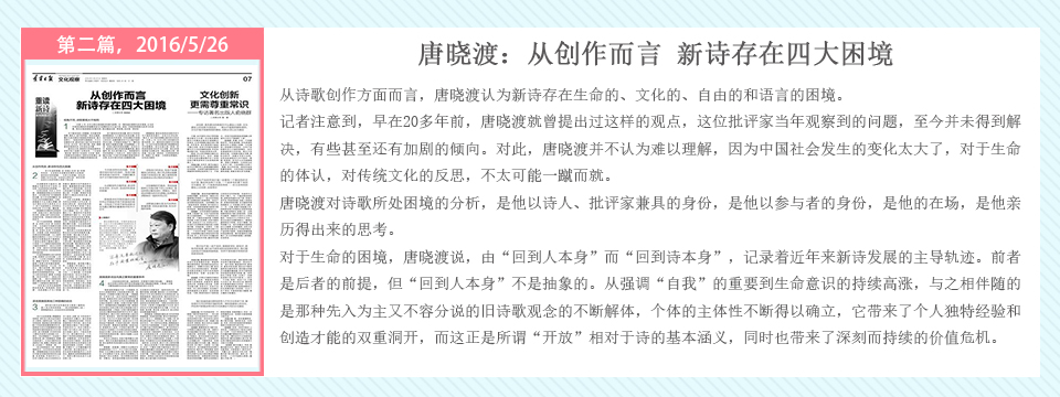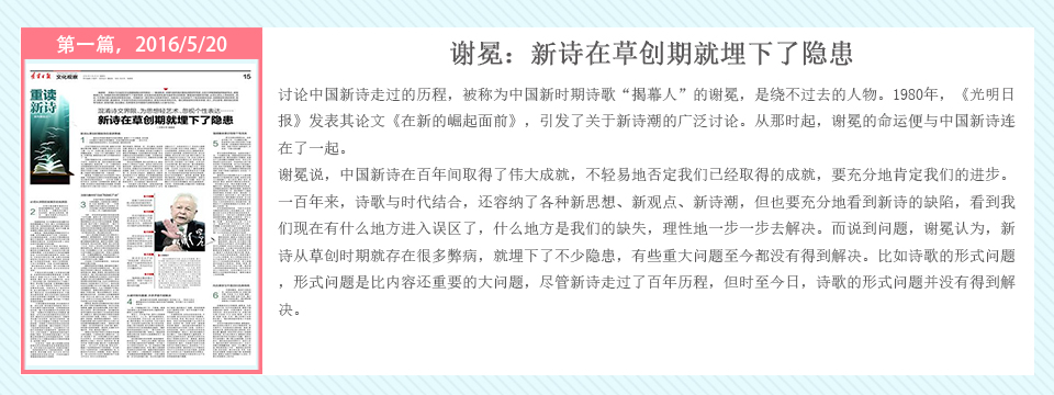 自2016年5月20日起,辽宁日报在其文化观察版推出了系列策划——重读百年新诗,由高慧斌博士采写,许维萍编辑,陆续对中国当代诗坛的耆宿、名家谢冕、郑敏、唐晓渡、西川等进行专访。中国新诗一直在问题的不断涌现与攻克中前行,无数诗人毕生为之呕心沥血,借百年新诗诞辰时机,回顾与梳理新诗家产,凝视与盘诘新诗难题,继往开来。