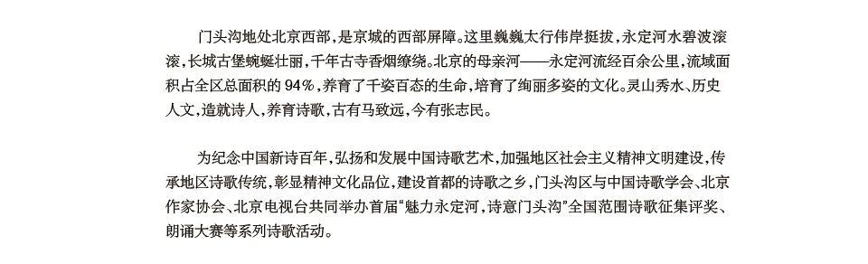 门头沟地处北京西部,是京城的西部屏障。这里巍巍太行伟岸挺拔,永定河水碧波滚滚,长城古堡蜿蜒壮丽,千年古寺香烟缭绕。北京的母亲河——永定河流经百余公里,流域面积占全区总面积的94%,养育了千姿百态的生命,培育了绚丽多姿的文化。灵山秀水、历史人文,造就诗人,养育诗歌,古有马致远,今有张志民。