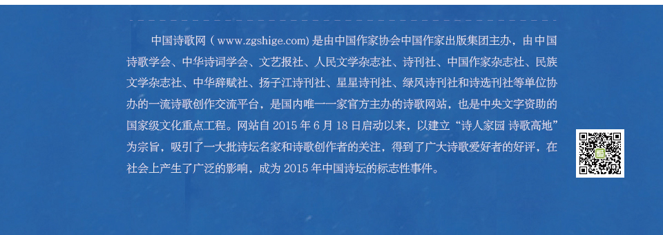 中国诗歌网(www.zgshige.com)是由中国作家协会中国作家出版集团主办,由中国诗歌学会、中华诗词学会、文艺报社、人民文学杂志社、诗刊社、中国作家杂志社、民族文学杂志社、中华辞赋社、扬子江诗刊社、星星诗刊社、绿风诗刊社和诗选刊社等单位协办的一流诗歌创作交流平台,是国内唯一一家官方主办的诗歌网站,也是中央文字资助的国家级文化重点工程。网站自2015年6月18日启动以来,以建立“诗人家园 诗歌高地”为宗旨,吸引了一大批诗坛名家和诗歌创作者的关注,得到了广大诗歌爱好者的好评,在社会上产生了广泛的影响,成为2015年中国诗坛的标志性事件。